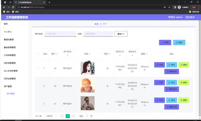 如图5.1显示的就是用户信息管理页面,此页面提供给管理员的功能有:用户信息的查询管理,可以删除用户信息、修改用户信息、新增用户信息,