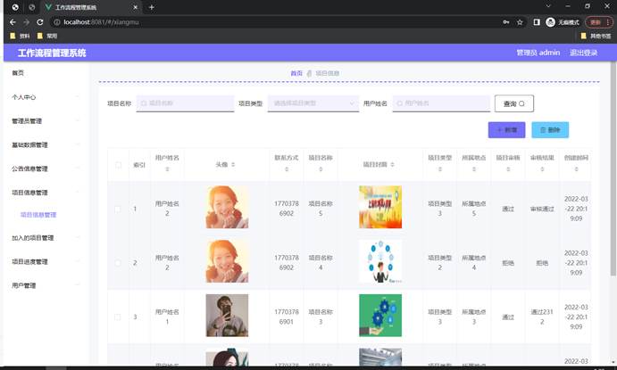 如图5.2显示的就是项目信息管理页面,此页面提供给管理员的功能有:查看已发布的项目信息数据,修改项目信息,项目信息作废,即可删除,还进行了对项目信息名称的模糊查询 项目信息信息的类型查询等等一些条件。