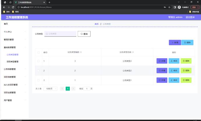 如图5.3显示的就是公告类型管理页面,此页面提供给管理员的功能有:根据公告类型进行条件查询,还可以对公告类型进行新增、修改、查询操作等等。