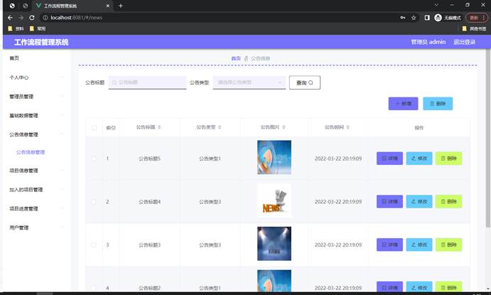 如图5.4显示的就是公告信息管理页面,此页面提供给管理员的功能有:根据公告信息进行新增、修改、查询操作等等。