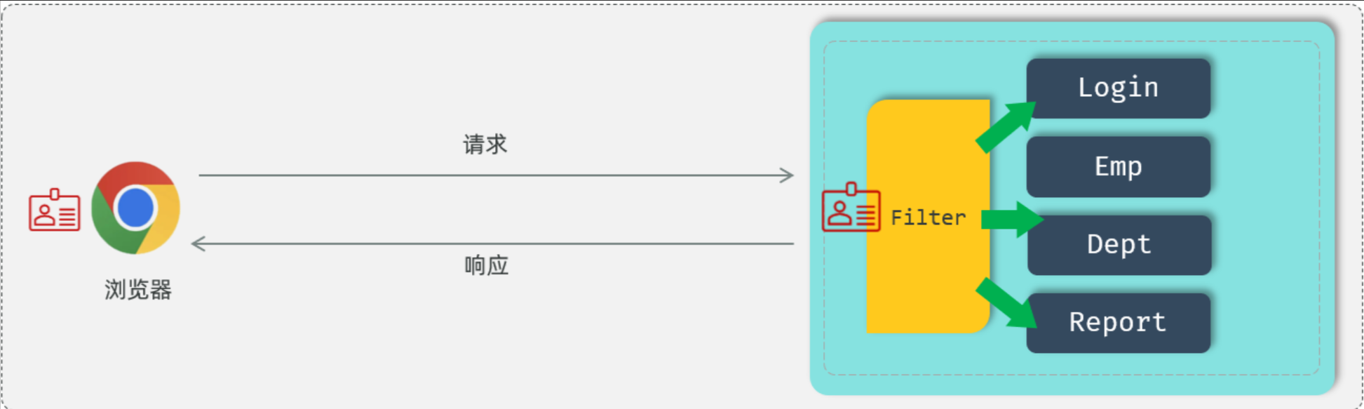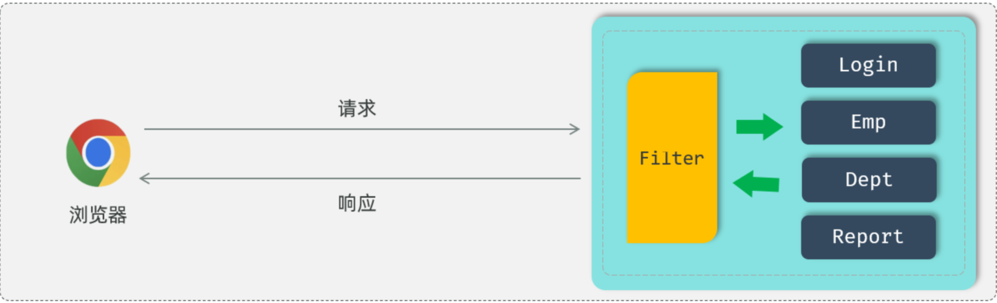使用了过滤器之后,要想访问web服务器上的资源,必须先经过滤器,过滤器处理完毕之后,才可以访问对应的资源。