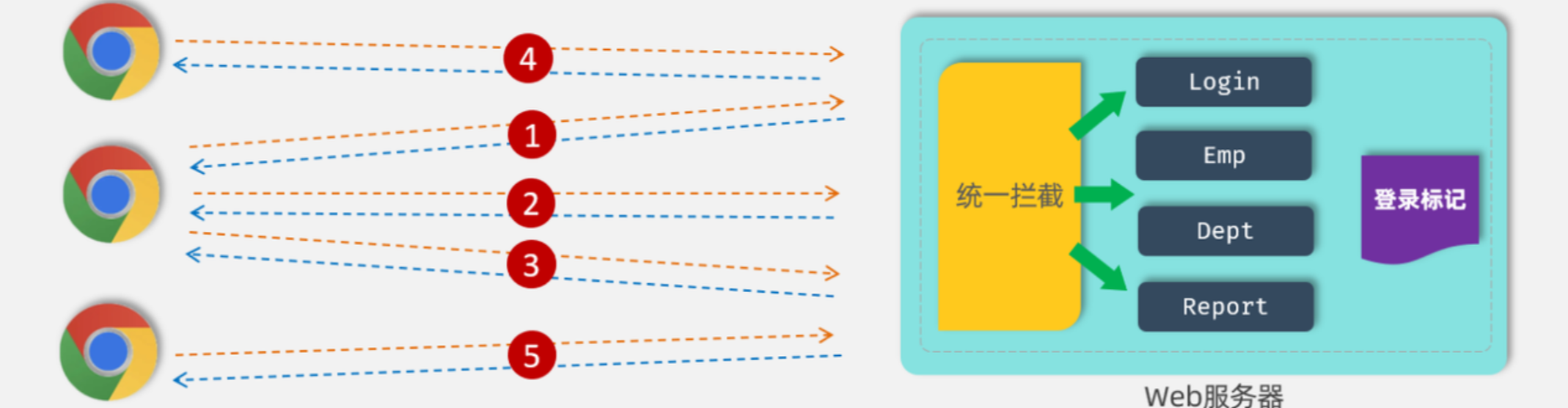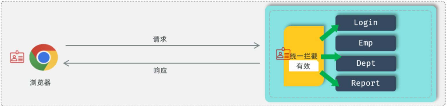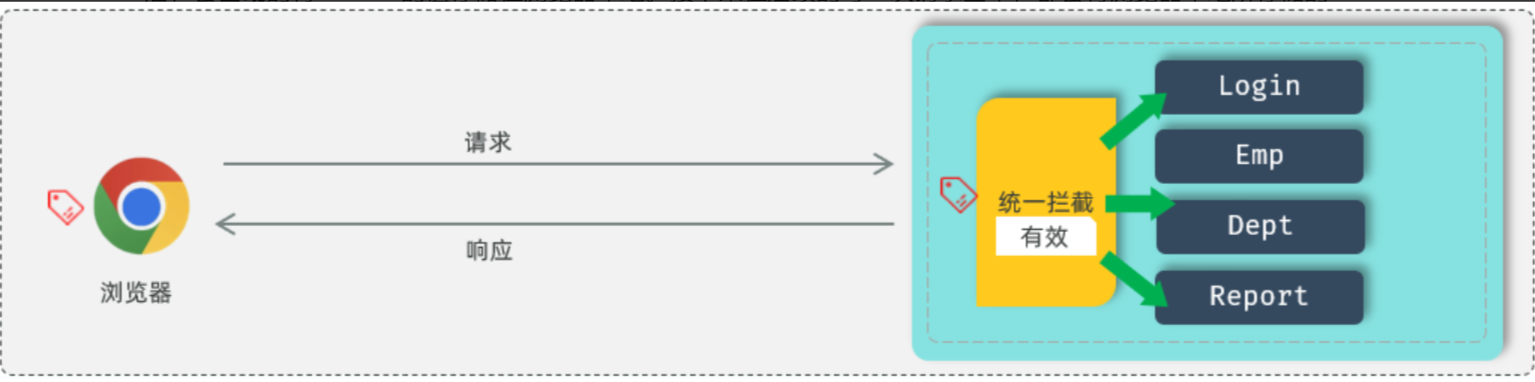通过统一拦截的技术,我们可以来拦截浏览器发送过来的所有的请求,拦截到这个请求之后,就可以通过请求来获取之前所存入的登录标记,在获取到登录标记且标记为登录成功,就说明员工已经登录了。如果已经登录,我们就直接放行。