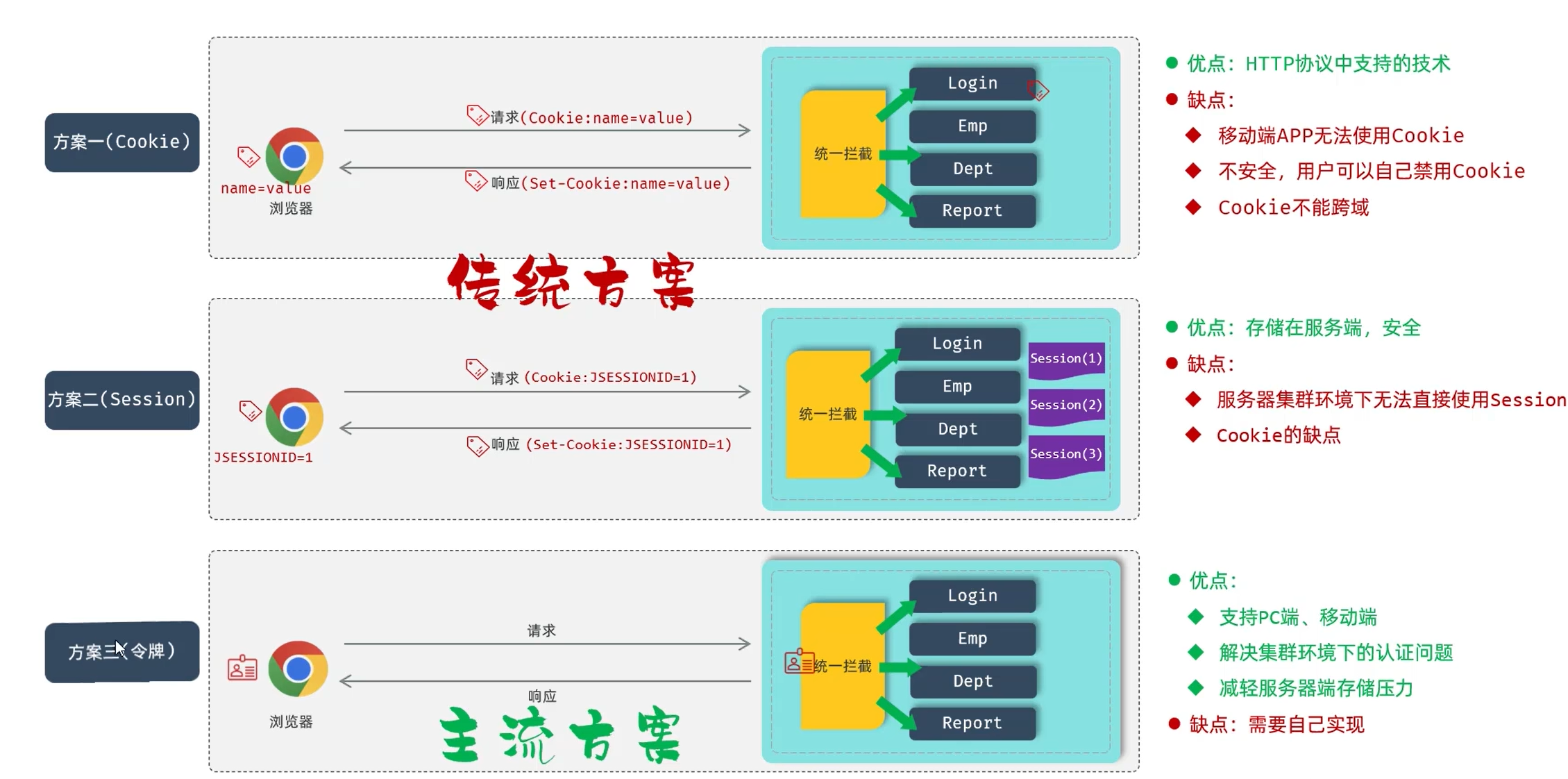 接下来,我们就来对比一下 3 种会话跟踪的技术方案。
