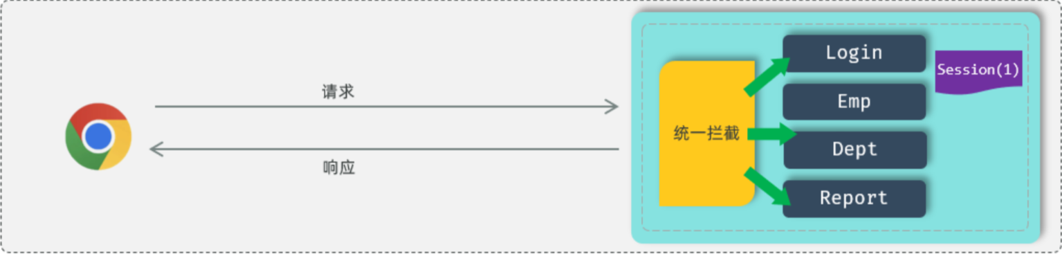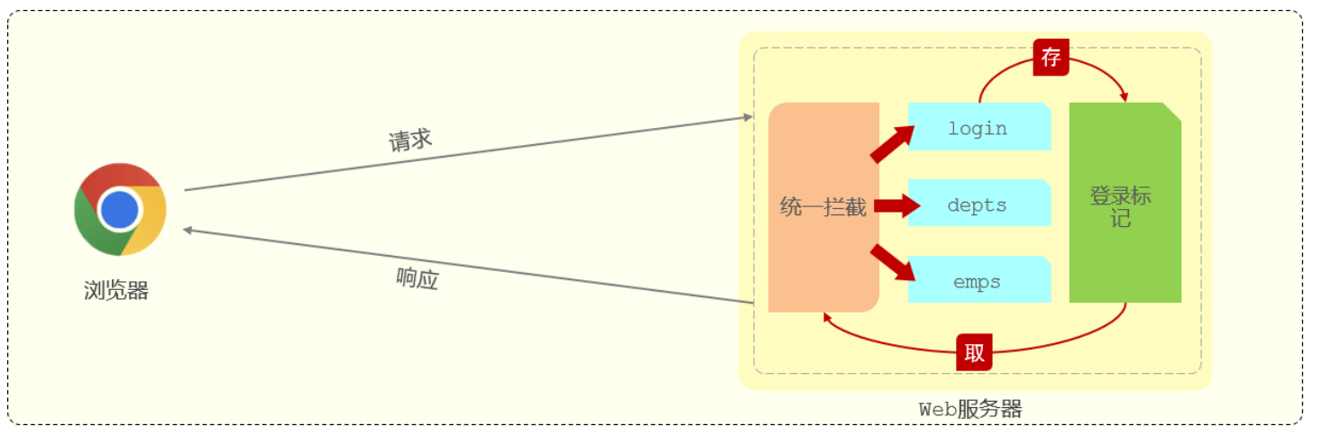 所谓登录校验,指的是我们在服务器端接收到浏览器发送过来的请求之后,首先我们要对请求进行校验。先要校验一下用户登录了没有,如果用户已经登录了,就直接执行对应的业务操作就可以了;如果用户没有登录,此时就不允许他执行相关的业务操作,直接给前端响应一个错误的结果,最终跳转到登录页面,要求他登录成功之后,再来访问对应的数据。