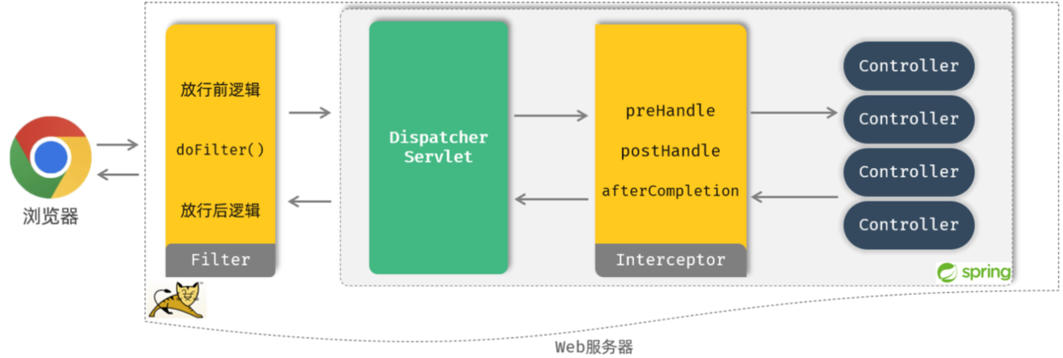 接口规范不同:过滤器需要实现Filter接口,而拦截器需要实现HandlerInterceptor接口。