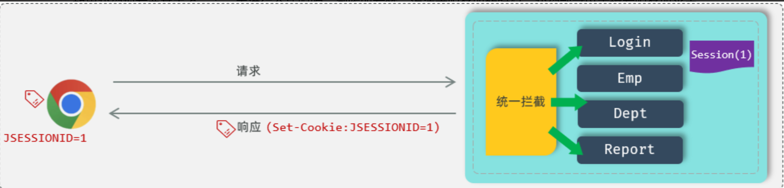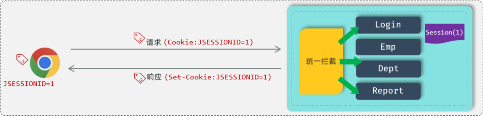 接下来,在后续的每次请求时,都会将Cookie的值,携带到服务端,那服务端呢,接收到Cookie之后,会自动的根据JSESSIONID的值,找到对应的会话对象Session。