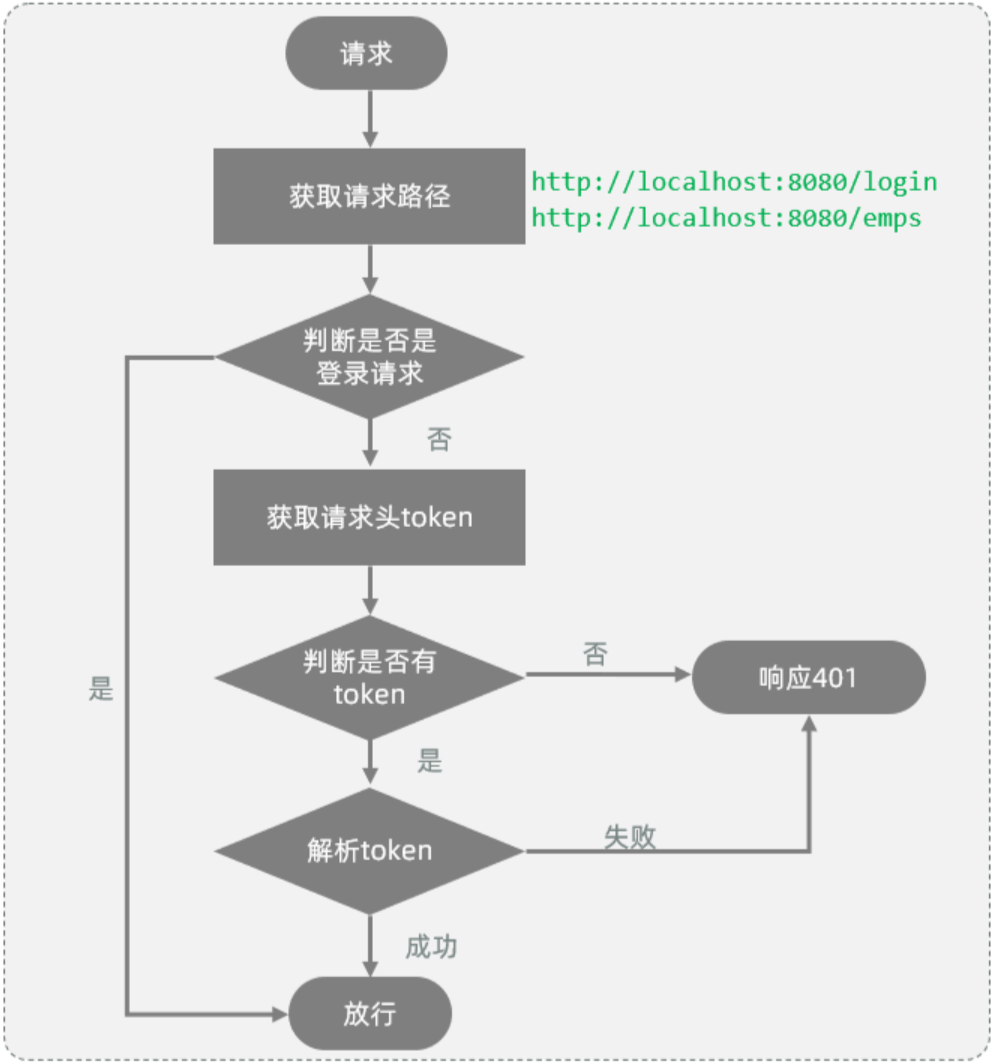 public class TokenInterceptor implements HandlerInterceptor {@Overridepublic boolean preHandle(HttpServletRequest request, HttpServletResponse response, Object handler) throws Exception {//1. 获取请求url。String url = request.getRequestURL().toString();//2. 判断请求url中是否包含login,如果包含,说明是登录操作,放行。if(url.contains("login")){ //登录请求log.info("登录请求 , 直接放行");return true;}//3. 获取请求头中的令牌(token)。String jwt = request.getHeader("token");//4. 判断令牌是否存在,如果不存在,返回错误结果(未登录)。if(!StringUtils.hasLength(jwt)){ //jwt为空log.info("获取到jwt令牌为空, 返回错误结果");response.setStatus(HttpStatus.SC_UNAUTHORIZED);return false;}//5. 解析token,如果解析失败,返回错误结果(未登录)。try {JwtUtils.parseJWT(jwt);} catch (Exception e) {e.printStackTrace();log.info("解析令牌失败, 返回错误结果");response.setStatus(HttpStatus.SC_UNAUTHORIZED);return false;}//6. 放行。log.info("令牌合法, 放行");return true;}}