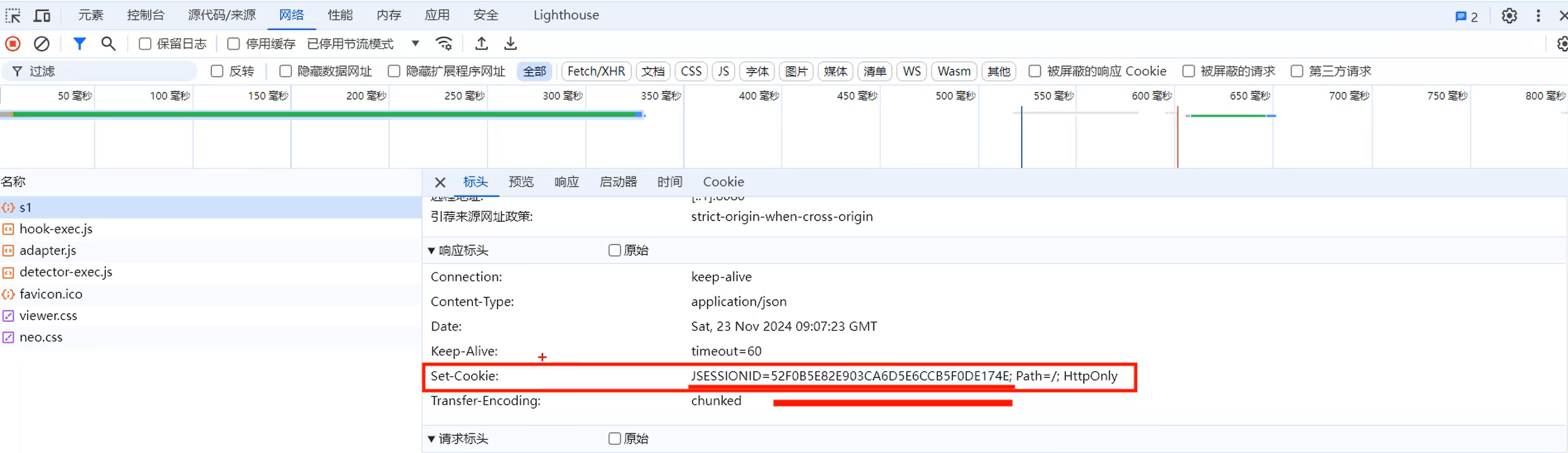 请求完成之后,在响应头中,就会看到有一个Set-Cookie的响应头,里面响应回来了一个Cookie,就是JSESSIONID,这个就是服务端会话对象 Session 的ID。