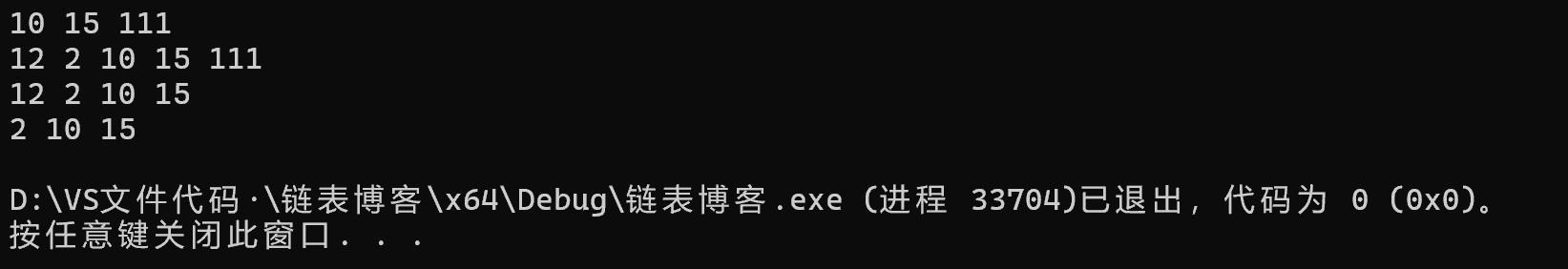 {ListNode* h;LTInit(&h);LTPushBack(h, 10); //10 LTPushBack(h, 15); //10 15 LTPushBack(h, 111); //10 15 111print(h);LTPushFront(h, 2); //2 10 15 111LTPushFront(h, 12); //12 2 10 15 111print(h);LTPopBack(h); // 12 2 10 15print(h);LTPopFront(h); //2 10 15print(h);LTDestory(h);