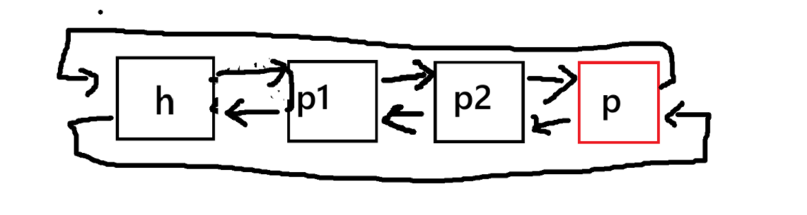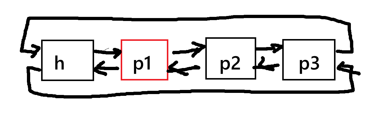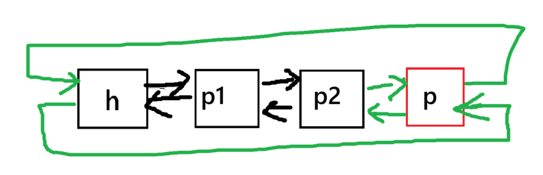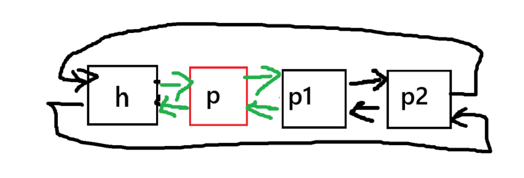 h->next = p->next; // 步骤1:头节点的next指向p的下一个节点(跳过p) p->next->prev = h; // 步骤2:p的下一个节点的prev指向头节点(反向指针同步)