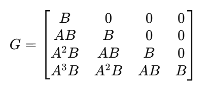 [ A^2 B A B B 0 ] → 三个控制依次累积影响 x_{k+3}