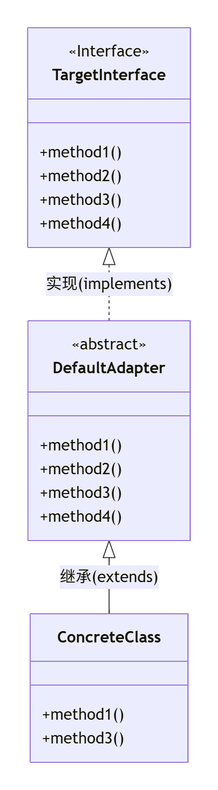 - 3.3.接口适配器模式(或缺省适配器):当一个接口方法太多,而我们只想使用其中一部分时,可以创建一个抽象类先空实现所有方法,我们再继承这个抽象类,只重写需要的方法。这就像你有一个多功能工具箱,但你只拿出螺丝刀来用,其他工具原样放着就好。