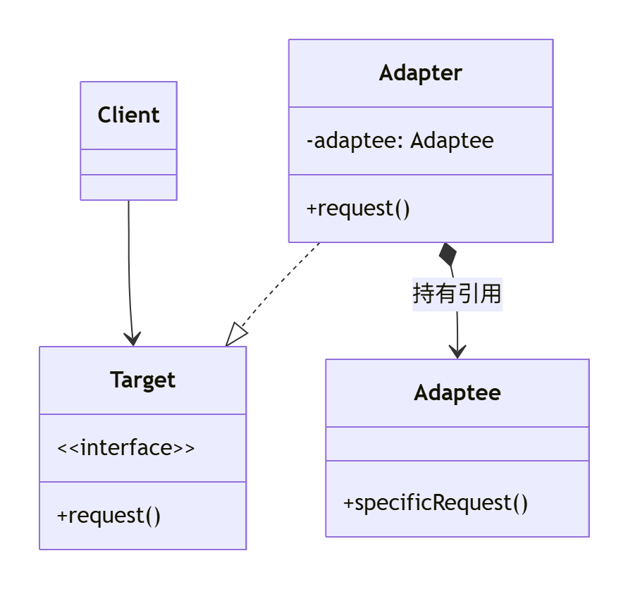 - 2.2.对象适配器模式:通过持有被适配类的实例(组合)来实现目标接口。这是最常用的方式,就像我们常见的那个独立的、两头都是插头的转换器。它更灵活,因为一个适配器可以适配多个不同的插座。