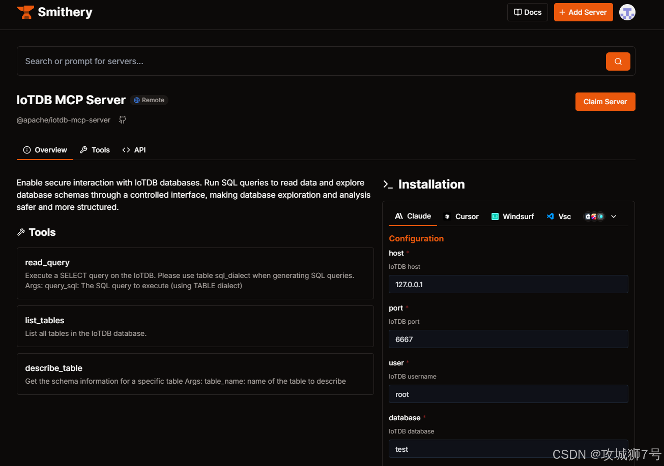 如果说以上特性让 IoTDB 成为了一款优秀的TSDB,那么其对 MCP(Model Context Protocol)的原生支持,则让它在AI时代占得了先机。