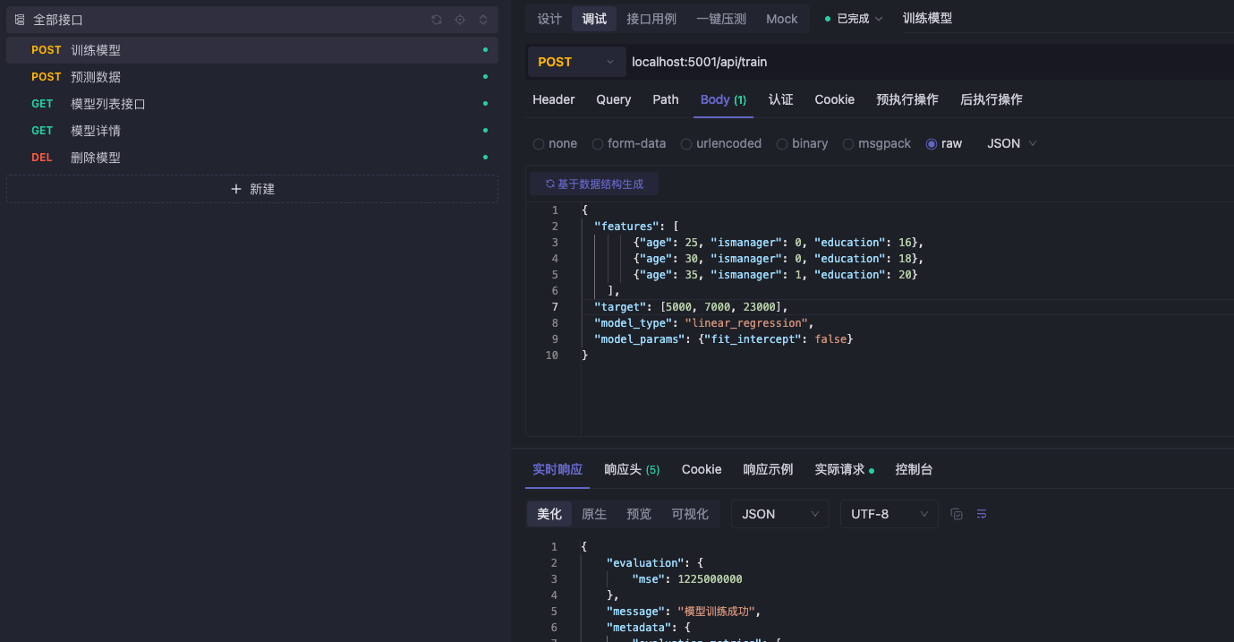 {"evaluation": {"mse": 1225000000},"message": "模型训练成功","metadata": {"evaluation_metrics": {"mse": 1225000000},"feature_count": 3,"feature_names": ["age","ismanager","education"],"is_classification": false,"model_id": "b1679812-9566-4f8b-a78a-735af78c51d1","model_params": {"fit_intercept": false},"model_type": "linear_regression","sample_count": 3,"training_date": "2025-11-13T10:08:09.474895"},"model_id": "b1679812-9566-4f8b-a78a-735af78c51d1","success": true