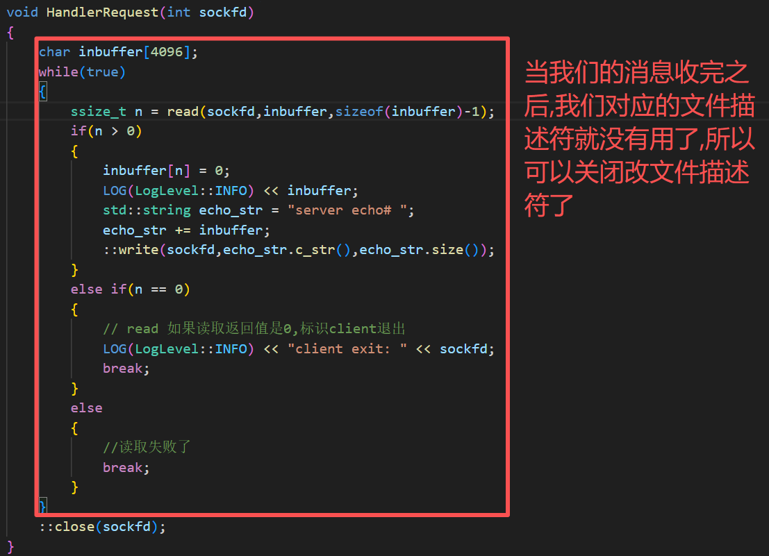 void HandlerRequest(int sockfd){char inbuffer[4096];while(true){ssize_t n = read(sockfd,inbuffer,sizeof(inbuffer)-1);if(n > 0){inbuffer[n] = 0;LOG(LogLevel::INFO) << inbuffer;std::string echo_str = "server echo# ";echo_str += inbuffer;::write(sockfd,echo_str.c_str(),echo_str.size());}else if(n == 0){// read 如果读取返回值是0,标识client退出LOG(LogLevel::INFO) << "client exit: " << sockfd;break;}else{//读取失败了break;}}::close(sockfd);}