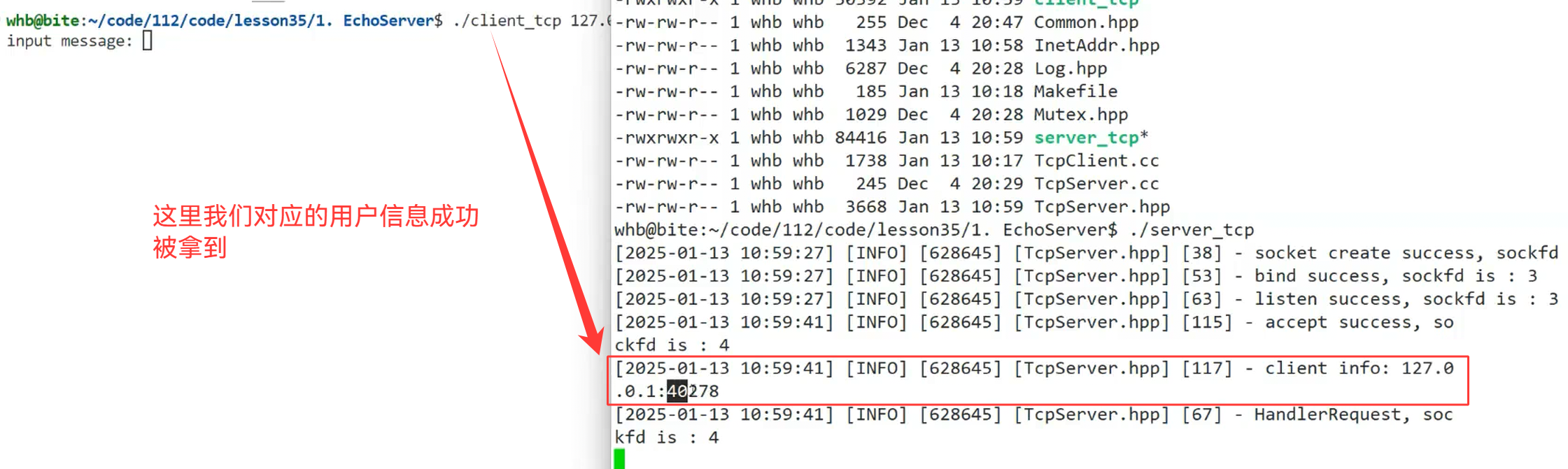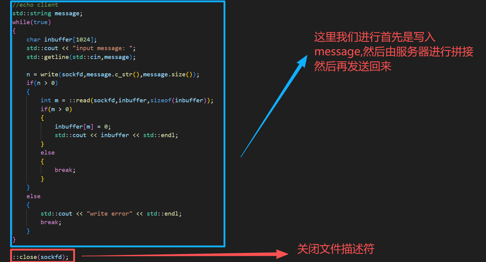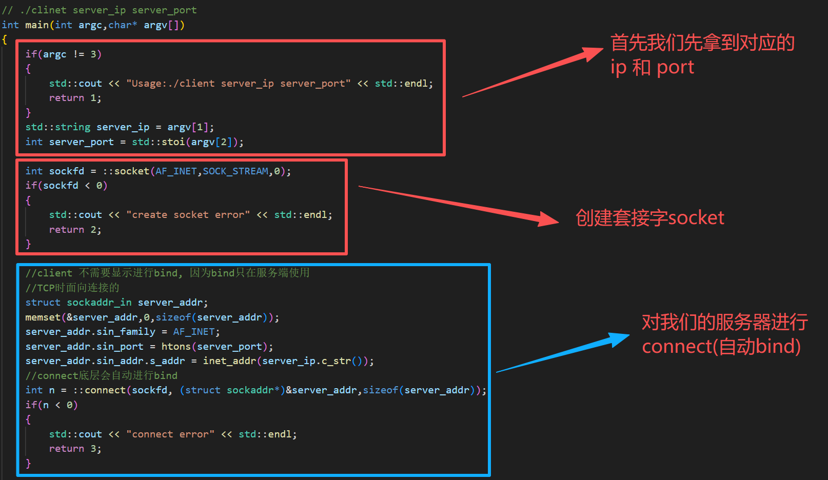 {if(argc != 3){std::cout << "Usage:./client server_ip server_port" << std::endl;return 1;}std::string server_ip = argv[1];int server_port = std::stoi(argv[2]);int sockfd = ::socket(AF_INET,SOCK_STREAM,0);if(sockfd < 0){std::cout << "create socket error" << std::endl;return 2;}//client 不需要显示进行bind, 因为bind只在服务端使用//TCP时面向连接的struct sockaddr_in server_addr;memset(&server_addr,0,sizeof(server_addr));server_addr.sin_family = AF_INET;server_addr.sin_port = htons(server_port);server_addr.sin_addr.s_addr = inet_addr(server_ip.c_str());//connect底层会自动进行bindint n = ::connect(sockfd, (struct sockaddr*)&server_addr,sizeof(server_addr));if(n < 0){std::cout << "connect error" << std::endl;return 3;}//echo clientstd::string message;while(true){char inbuffer[1024];std::cout << "input message: ";std::getline(std::cin,message);n = write(sockfd,message.c_str(),message.size());if(n > 0){int m = ::read(sockfd,inbuffer,sizeof(inbuffer));if(m > 0){inbuffer[m] = 0;std::cout << inbuffer << std::endl;}else{break;}}else{std::cout << "write error" << std::endl;break;}}::close(sockfd);return 0;
