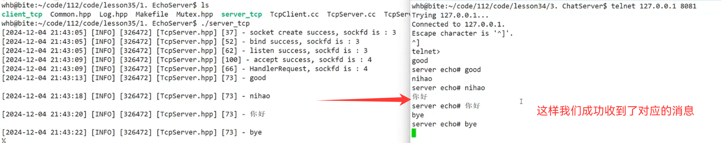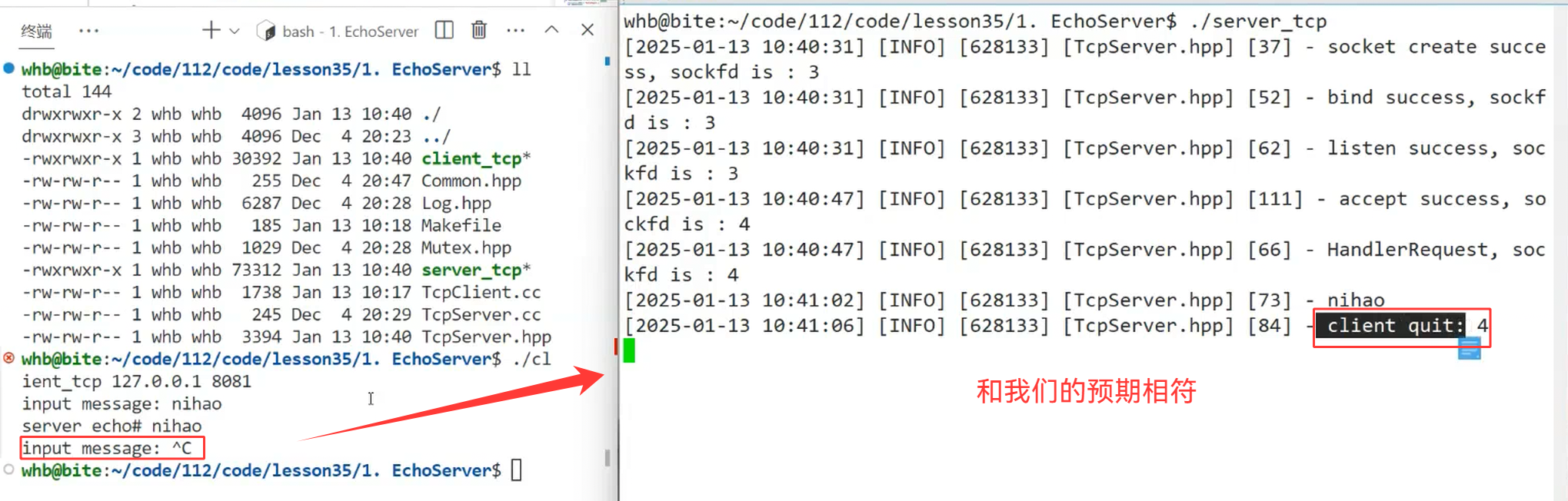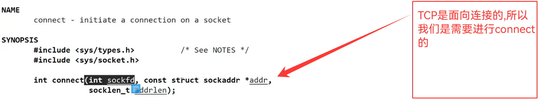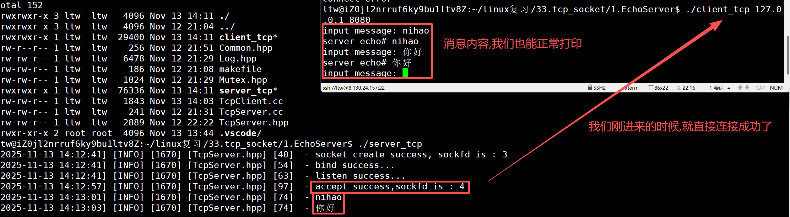{if(argc != 3){std::cout << "Usage:./client server_ip server_port" << std::endl;return 1;}std::string server_ip = argv[1];int server_port = std::stoi(argv[2]);int sockfd = ::socket(AF_INET,SOCK_STREAM,0);if(sockfd < 0){std::cout << "create socket error" << std::endl;return 2;}//client 不需要显示进行bind, 因为bind只在服务端使用//TCP时面向连接的struct sockaddr_in server_addr;memset(&server_addr,0,sizeof(server_addr));server_addr.sin_family = AF_INET;server_addr.sin_port = htons(server_port);server_addr.sin_addr.s_addr = inet_addr(server_ip.c_str());//connect底层会自动进行bindint n = ::connect(sockfd, (struct sockaddr*)&server_addr,sizeof(server_addr));if(n < 0){std::cout << "connect error" << std::endl;return 3;}//echo clientstd::string message;while(true){char inbuffer[1024];std::cout << "input message: ";std::getline(std::cin,message);n = write(sockfd,message.c_str(),message.size());if(n > 0){int m = ::read(sockfd,inbuffer,sizeof(inbuffer));if(m > 0){inbuffer[m] = 0;std::cout << inbuffer << std::endl;}else{break;}}else{std::cout << "write error" << std::endl;break;}}::close(sockfd);return 0;