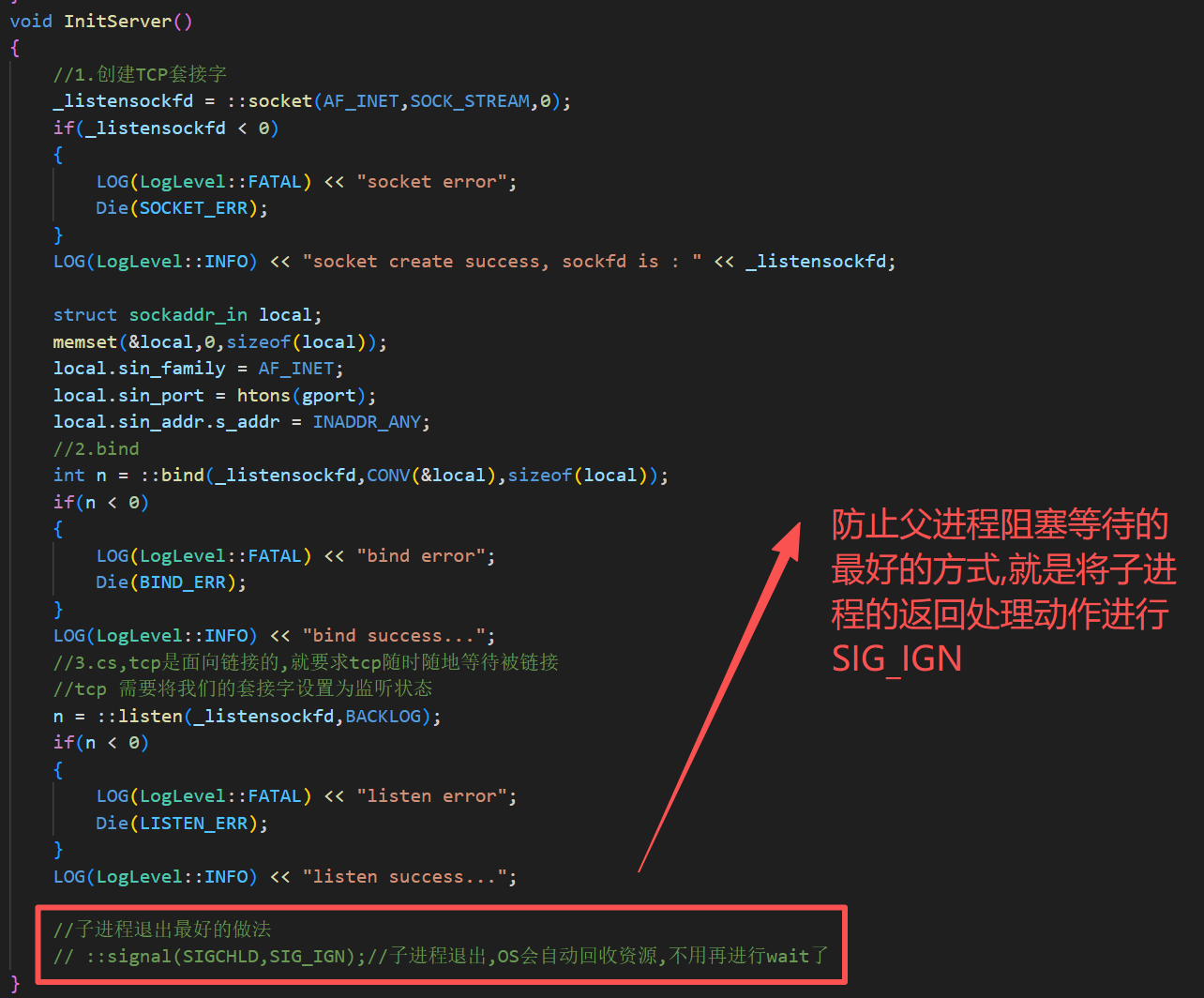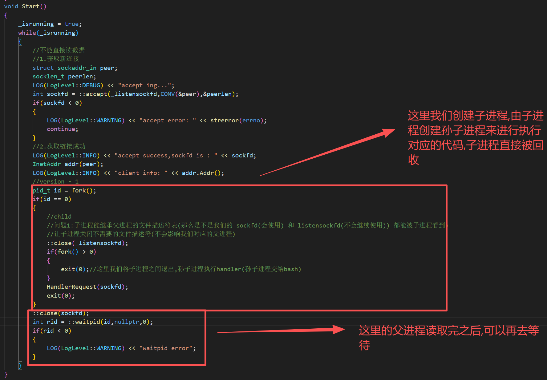 public:TcpServer(int port = gport):_port(port),_isrunning(false){}void InitServer(){//1.创建TCP套接字_listensockfd = ::socket(AF_INET,SOCK_STREAM,0);if(_listensockfd < 0){LOG(LogLevel::FATAL) << "socket error";Die(SOCKET_ERR);}LOG(LogLevel::INFO) << "socket create success, sockfd is : " << _listensockfd;struct sockaddr_in local;memset(&local,0,sizeof(local));local.sin_family = AF_INET;local.sin_port = htons(gport);local.sin_addr.s_addr = INADDR_ANY;//2.bindint n = ::bind(_listensockfd,CONV(&local),sizeof(local));if(n < 0){LOG(LogLevel::FATAL) << "bind error";Die(BIND_ERR);}LOG(LogLevel::INFO) << "bind success...";//3.cs,tcp是面向链接的,就要求tcp随时随地等待被链接//tcp 需要将我们的套接字设置为监听状态n = ::listen(_listensockfd,BACKLOG);if(n < 0){LOG(LogLevel::FATAL) << "listen error";Die(LISTEN_ERR);}LOG(LogLevel::INFO) << "listen success...";//子进程退出最好的做法// ::signal(SIGCHLD,SIG_IGN);//子进程退出,OS会自动回收资源,不用再进行wait了}void HandlerRequest(int sockfd){char inbuffer[4096];while(true){ssize_t n = read(sockfd,inbuffer,sizeof(inbuffer)-1);if(n > 0){inbuffer[n] = 0;LOG(LogLevel::INFO) << inbuffer;std::string echo_str = "server echo# ";echo_str += inbuffer;::write(sockfd,echo_str.c_str(),echo_str.size());}else if(n == 0){// read 如果读取返回值是0,标识client退出LOG(LogLevel::INFO) << "client exit: " << sockfd;break;}else{//读取失败了break;}}::close(sockfd);}void Start(){_isrunning = true;while(_isrunning){//不能直接读数据//1.获取新连接struct sockaddr_in peer;socklen_t peerlen = sizeof(peer);LOG(LogLevel::DEBUG) << "accept ing...";int sockfd = ::accept(_listensockfd,CONV(&peer),&peerlen);if(sockfd < 0){LOG(LogLevel::WARNING) << "accept error: " << strerror(errno);continue;}//2.获取链接成功LOG(LogLevel::INFO) << "accept success,sockfd is : " << sockfd;InetAddr addr(peer);LOG(LogLevel::INFO) << "client info: " << addr.Addr();//version - 1pid_t id = fork();if(id == 0){//child//问题1:子进程能继承父进程的文件描述符表(那么是不是我们的 sockfd(会使用) 和 listensockfd(不会继续使用)) 都能被子进程看到)//让子进程关闭不需要的文件描述符(不会影响我们对应的父进程)::close(_listensockfd);if(fork() > 0){exit(0);//这里我们将子进程之间退出,孙子进程执行handler(孙子进程交给bash)}HandlerRequest(sockfd);exit(0);}::close(sockfd);int rid = ::waitpid(id,nullptr,0);if(rid < 0){LOG(LogLevel::WARNING) << "waitpid error";}}}void Stop(){_isrunning = false;}~TcpServer(){}