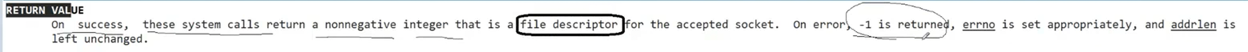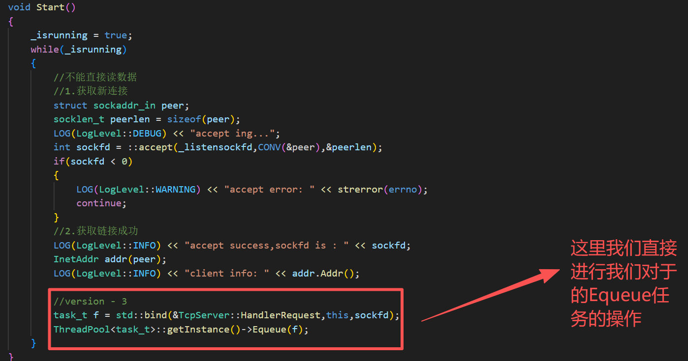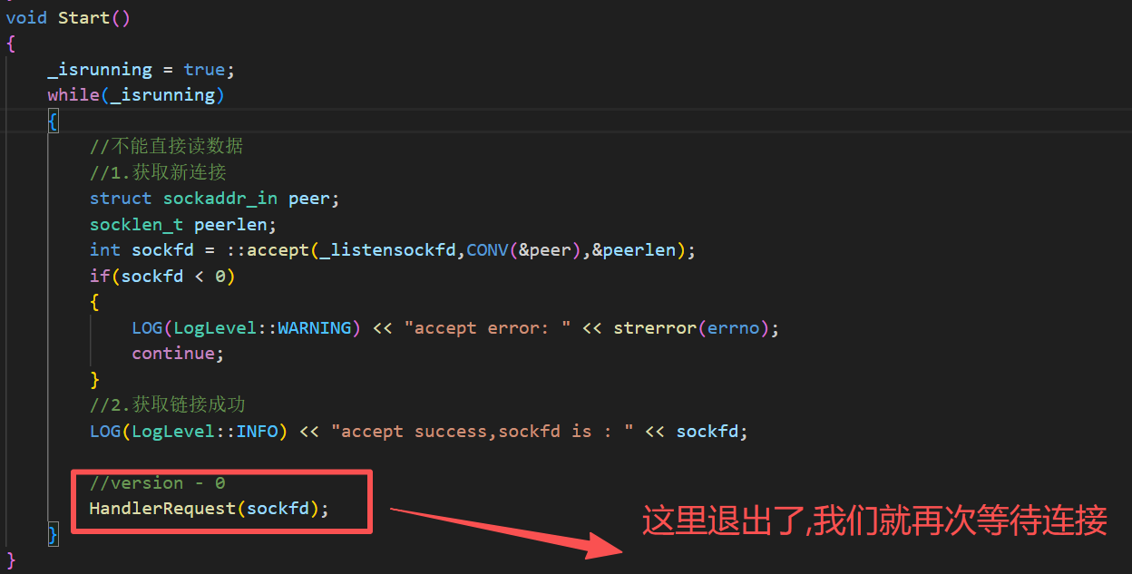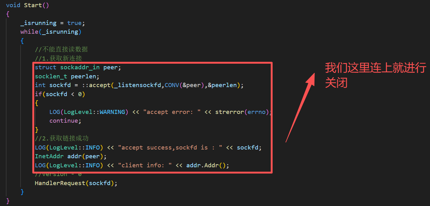 void Start(){_isrunning = true;while(_isrunning){//不能直接读数据//1.获取新连接struct sockaddr_in peer;socklen_t peerlen;int sockfd = ::accept(_listensockfd,CONV(&peer),&peerlen);if(sockfd < 0){LOG(LogLevel::WARNING) << "accept error: " << strerror(errno);continue;}//2.获取链接成功LOG(LogLevel::INFO) << "accept success,sockfd is : " << sockfd;}}