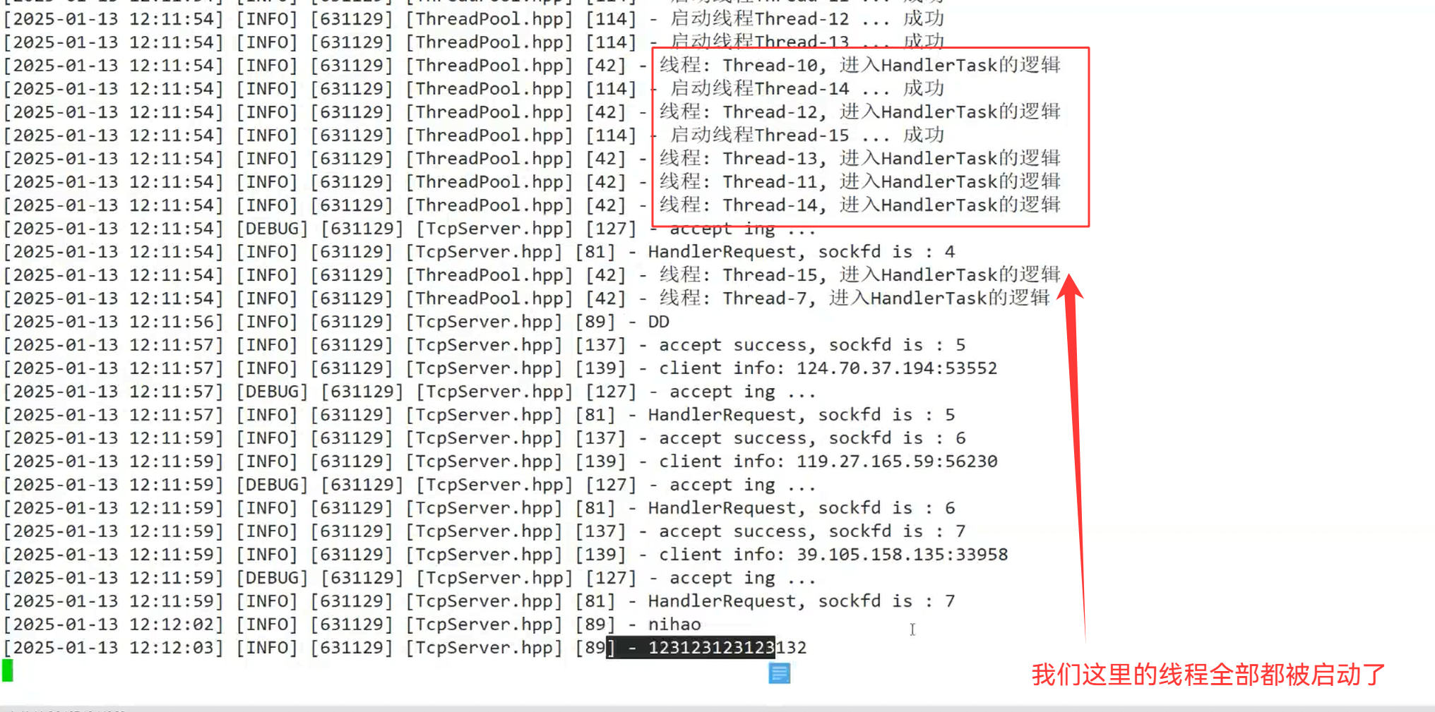 {using namespace LogModule;using namespace ThreadModule;using namespace LockModule;using namespace CondModule;using thread_t = std::shared_ptr<Thread>;void DefaultTest(){while(true){LOG(LogLevel::DEBUG) << "我是一个测试方法";sleep(1);}}const static int defaultnum = 5;template<class T>class ThreadPool{private:bool IsEmpty(){return _taskq.empty();}void HandlerTask(){LOG(LogLevel::INFO) << "线程" << name << ", 进入HandlerTask的逻辑";while(true){//1.拿任务T t;{LockGuard lockguard(_lock);while(IsEmpty() && _isrunning){_wait_num++;_cond.Wait(_lock);_wait_num--;}//任务弄完了,并且线程池退出了,就退出if(IsEmpty() && !_isrunning){break;}t = _taskq.front();_taskq.pop();}//2.处理任务t(); //规定,未来所有的任务处理,全部都是必须提供()方法!}}ThreadPool(const ThreadPool<T>&) = delete;ThreadPool<T>& operator=(const ThreadPool<T>&) = delete;ThreadPool(int num = defaultnum):_num(num),_wait_num(0),_isrunning(false){for(int i = 0;i < _num;i++){_threads.push_back(std::make_shared<Thread>(std::bind(&ThreadPool::HandlerTask,this,std::placeholders::_1)));LOG(LogLevel::DEBUG) << "构建线程" << _threads[i]->Name() << "对象 ... 成功";}}public:static ThreadPool<T>* getInstance(){if(instance == NULL){LockGuard lockguard(mutex);if(instance == NULL){LOG(LogLevel::INFO) << "单例首次被执行,需要加载对象...";instance = new ThreadPool<T>();instance->Start();}return instance;}}void Equeue(T& in){LockGuard lockguard(_lock);if(!_isrunning){return;}_taskq.push(in);if(_wait_num > 0){_cond.Notify();}}void Start(){if(_isrunning){return;}_isrunning = true;for(auto& thread_ptr : _threads){thread_ptr->Start();LOG(LogLevel::DEBUG) << "启动线程" << thread_ptr->Name() << " ... 成功";}}void Wait(){for(auto& thread_ptr : _threads){thread_ptr->Join();LOG(LogLevel::DEBUG) << "停止线程" << thread_ptr->Name() << " ... 成功";}}void Stop(){LockGuard lockguard(_lock);if(_isrunning)//3.不能再入任务了{_isrunning = false;//1.让线程自己退出(唤醒) && 2.历史任务处理完if(_wait_num > 0){_cond.NotifyAll();}}}~ThreadPool(){}private:int _num;int _wait_num;std::queue<T> _taskq;std::vector<thread_t> _threads;Mutex _lock;Cond _cond;bool _isrunning;static ThreadPool<T>* instance;static Mutex mutex;//只用于保护单例};template<class T>ThreadPool<T>* ThreadPool<T>::instance = NULL;template<class T>Mutex ThreadPool<T>::mutex;