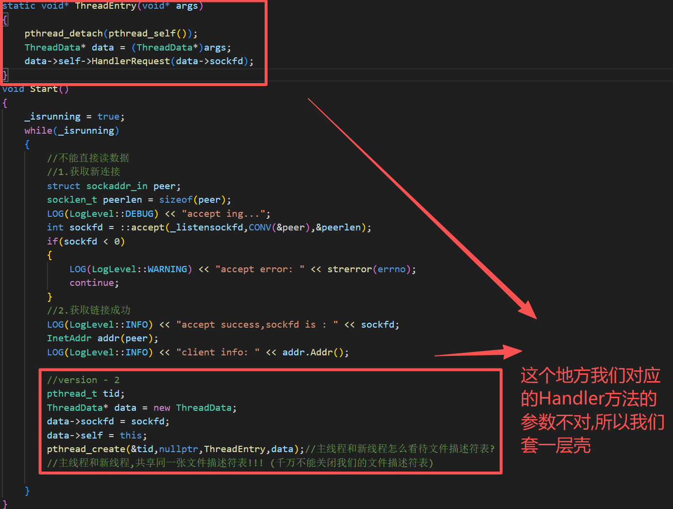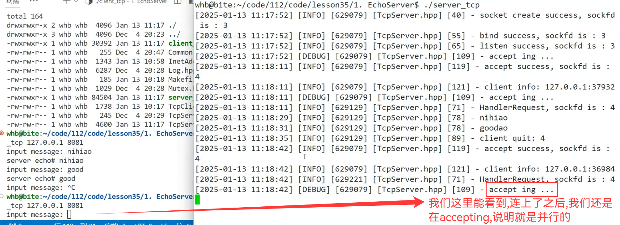 public:TcpServer(int port = gport):_port(port),_isrunning(false){}void InitServer(){//1.创建TCP套接字_listensockfd = ::socket(AF_INET,SOCK_STREAM,0);if(_listensockfd < 0){LOG(LogLevel::FATAL) << "socket error";Die(SOCKET_ERR);}LOG(LogLevel::INFO) << "socket create success, sockfd is : " << _listensockfd;struct sockaddr_in local;memset(&local,0,sizeof(local));local.sin_family = AF_INET;local.sin_port = htons(gport);local.sin_addr.s_addr = INADDR_ANY;//2.bindint n = ::bind(_listensockfd,CONV(&local),sizeof(local));if(n < 0){LOG(LogLevel::FATAL) << "bind error";Die(BIND_ERR);}LOG(LogLevel::INFO) << "bind success...";//3.cs,tcp是面向链接的,就要求tcp随时随地等待被链接//tcp 需要将我们的套接字设置为监听状态n = ::listen(_listensockfd,BACKLOG);if(n < 0){LOG(LogLevel::FATAL) << "listen error";Die(LISTEN_ERR);}LOG(LogLevel::INFO) << "listen success...";//子进程退出最好的做法// ::signal(SIGCHLD,SIG_IGN);//子进程退出,OS会自动回收资源,不用再进行wait了}void HandlerRequest(int sockfd){char inbuffer[4096];while(true){ssize_t n = read(sockfd,inbuffer,sizeof(inbuffer)-1);if(n > 0){inbuffer[n] = 0;LOG(LogLevel::INFO) << inbuffer;std::string echo_str = "server echo# ";echo_str += inbuffer;::write(sockfd,echo_str.c_str(),echo_str.size());}else if(n == 0){// read 如果读取返回值是0,标识client退出LOG(LogLevel::INFO) << "client exit: " << sockfd;break;}else{//读取失败了break;}}::close(sockfd);}static void* ThreadEntry(void* args){pthread_detach(pthread_self());ThreadData* data = (ThreadData*)args;data->self->HandlerRequest(data->sockfd);return nullptr;}void Start(){_isrunning = true;while(_isrunning){//不能直接读数据//1.获取新连接struct sockaddr_in peer;socklen_t peerlen = sizeof(peer);LOG(LogLevel::DEBUG) << "accept ing...";int sockfd = ::accept(_listensockfd,CONV(&peer),&peerlen);if(sockfd < 0){LOG(LogLevel::WARNING) << "accept error: " << strerror(errno);continue;}//2.获取链接成功LOG(LogLevel::INFO) << "accept success,sockfd is : " << sockfd;InetAddr addr(peer);LOG(LogLevel::INFO) << "client info: " << addr.Addr();//version - 2pthread_t tid;ThreadData* data = new ThreadData;data->sockfd = sockfd;data->self = this;pthread_create(&tid,nullptr,ThreadEntry,data);//主线程和新线程怎么看待文件描述符表?//主线程和新线程,共享同一张文件描述符表!!! (千万不能关闭我们的文件描述符表)}}void Stop(){_isrunning = false;}~TcpServer(){}