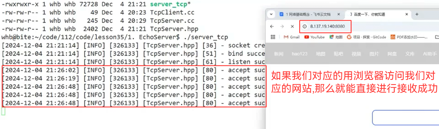 void InitServer(){//1.创建TCP套接字_sockfd = ::socket(AF_INET,SOCK_STREAM,0);if(_sockfd < 0){LOG(LogLevel::FATAL) << "socket error";Die(SOCKET_ERR);}LOG(LogLevel::INFO) << "socket create success, sockfd is : " << _sockfd;struct sockaddr_in local;memset(&local,0,sizeof(local));local.sin_family = AF_INET;local.sin_port = htons(gport);local.sin_addr.s_addr = INADDR_ANY;//2.bindint n = ::bind(_sockfd,CONV(&local),sizeof(local));if(n < 0){LOG(LogLevel::FATAL) << "bind error";Die(BIND_ERR);}LOG(LogLevel::INFO) << "bind success...";//3.cs,tcp是面向链接的,就要求tcp随时随地等待被链接//tcp 需要将我们的套接字设置为监听状态n = ::listen(_sockfd,BACKLOG);if(n < 0){LOG(LogLevel::FATAL) << "listen error";Die(LISTEN_ERR);}LOG(LogLevel::INFO) << "listen success...";}