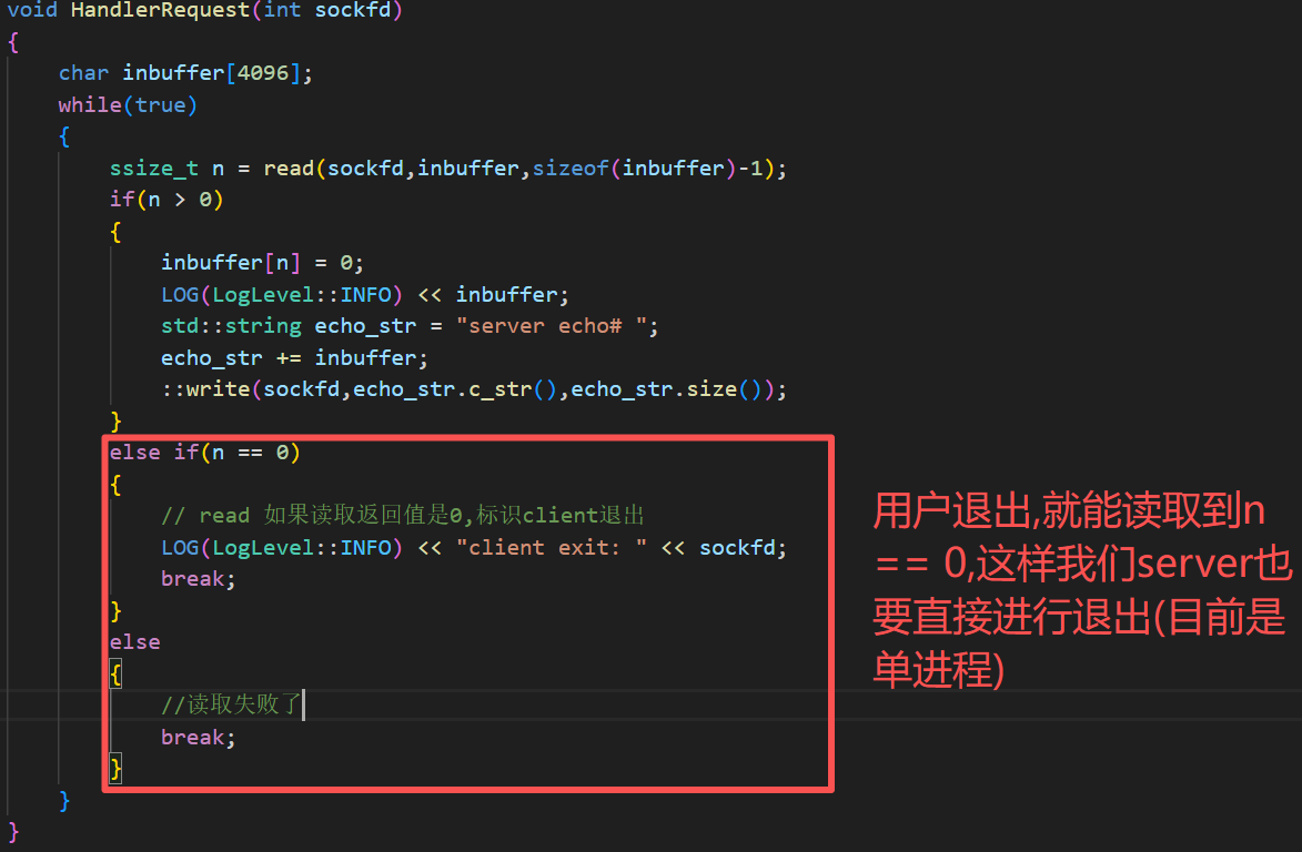void HandlerRequest(int sockfd){char inbuffer[4096];while(true){ssize_t n = read(sockfd,inbuffer,sizeof(inbuffer)-1);if(n > 0){inbuffer[n] = 0;LOG(LogLevel::INFO) << inbuffer;std::string echo_str = "server echo# ";echo_str += inbuffer;::write(sockfd,echo_str.c_str(),echo_str.size());}else if(n == 0){// read 如果读取返回值是0,标识client退出LOG(LogLevel::INFO) << "client exit: " << sockfd;break;}else{//读取失败了break;}}}