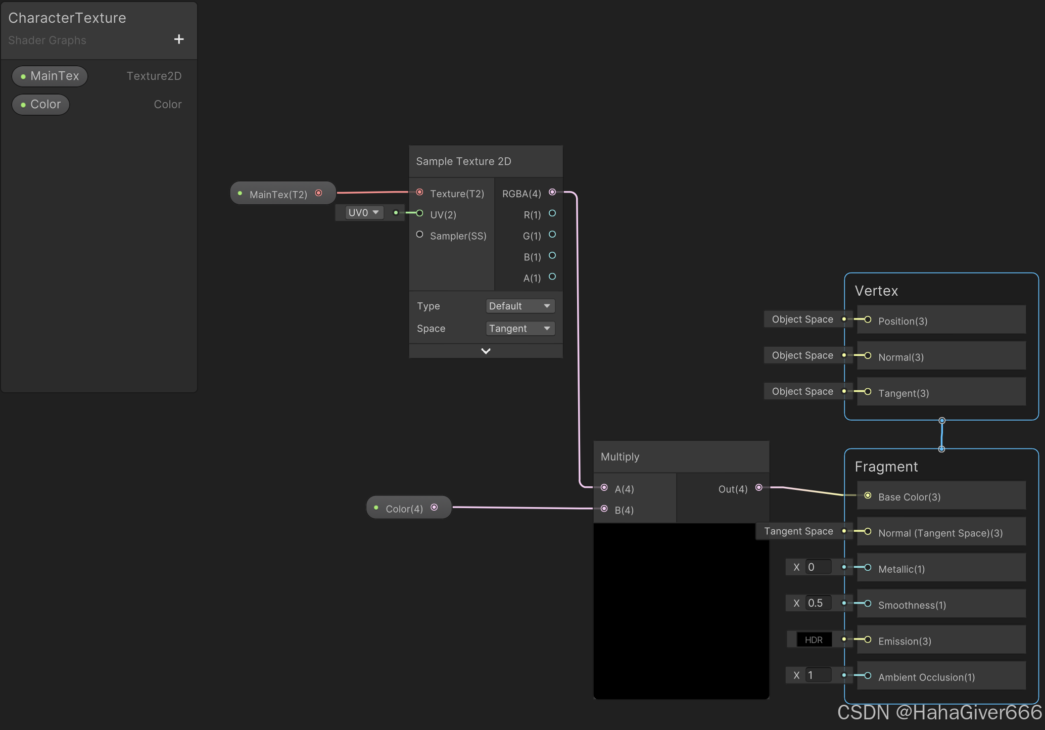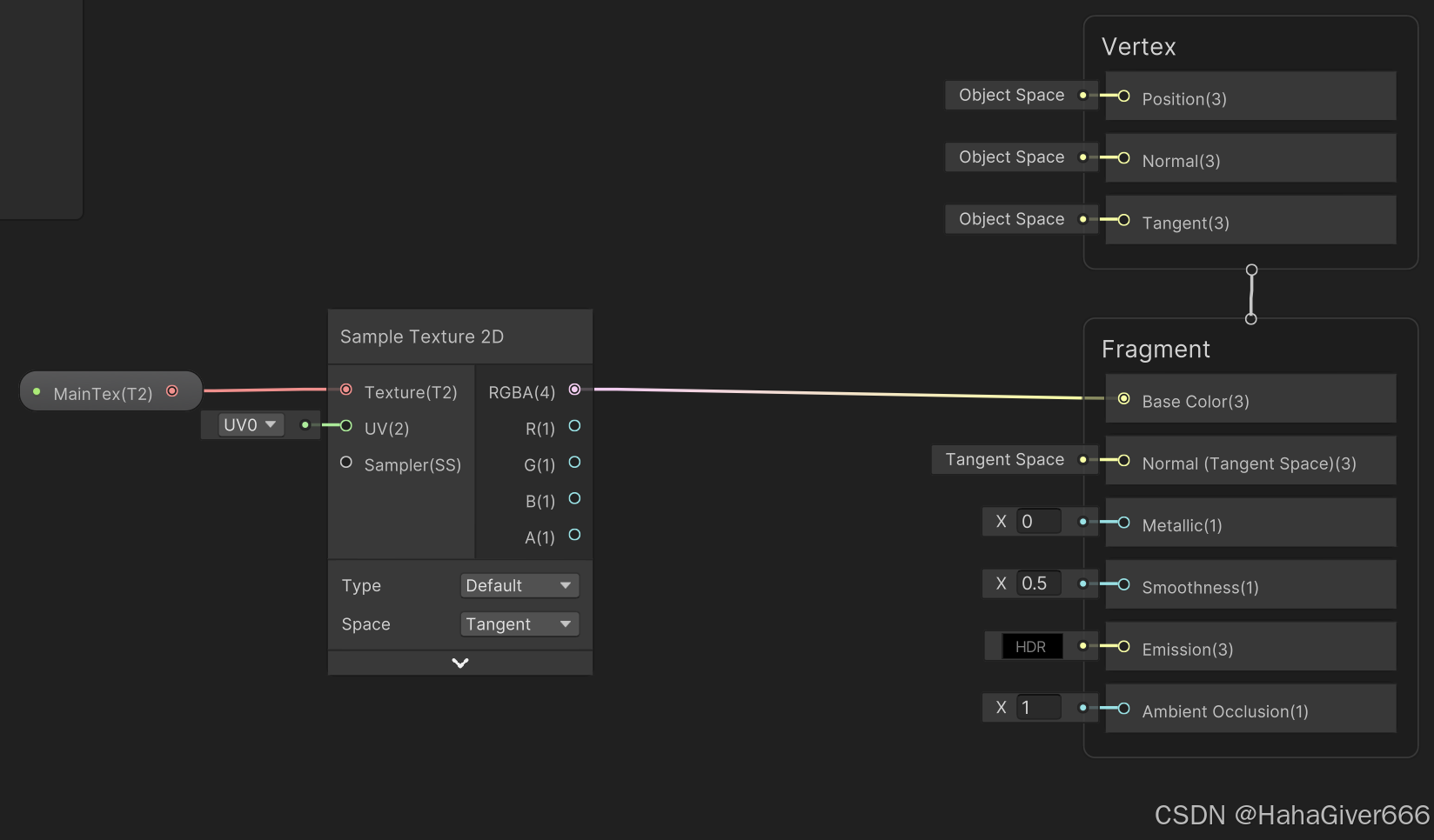 将MainTex变量拖拽到 Shader Graph的节点视图里,并新建一个Sample Texture 2D的节点,因为贴图的数据是不能直接在Shader Graph的节点视图里进行使用的,我们需要将其做采样处理,转化为可以使用的RBGA值,将MainTex变量的数据输出到Sample Texture 2D节点的 Texture输入中,即可获得该贴图的数据,然后将贴图采样的数据RGBA值连接到Fragment节点的Base Color上,也就是输出的颜色。