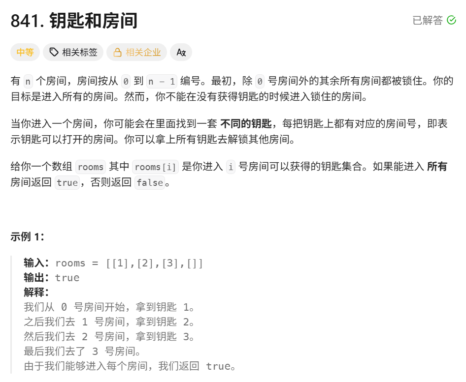 rooms数组(列表的列表)。rooms[i]是一个列表,存放着你在i号房间能找到的所有钥匙(即你能从i房打开哪些房门)。 -