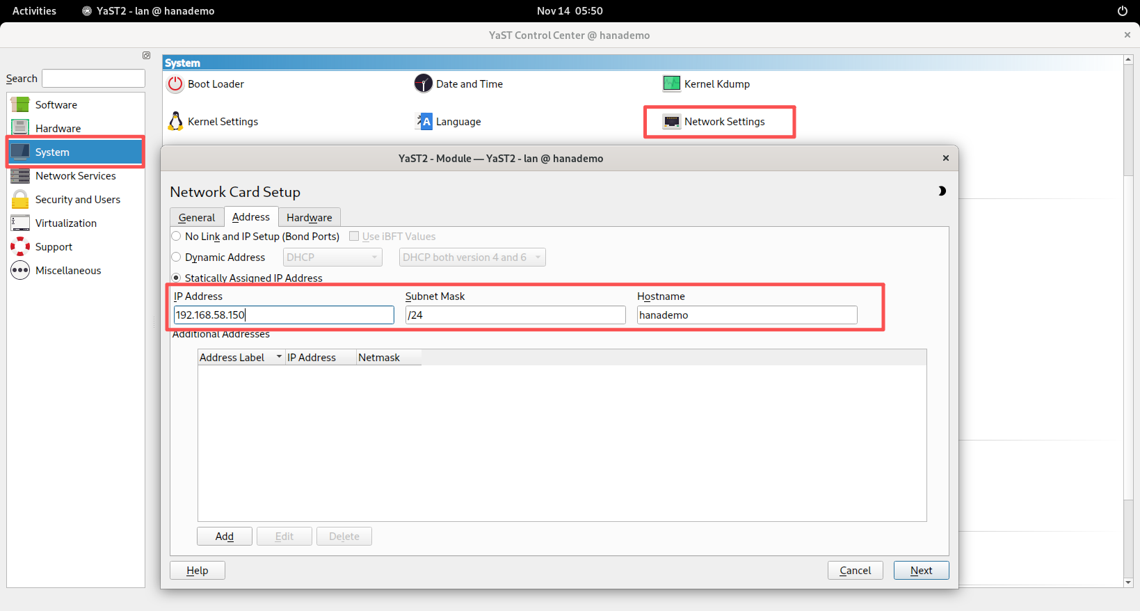 - 修改IP的话,需要打开Yast-System-Network Setting