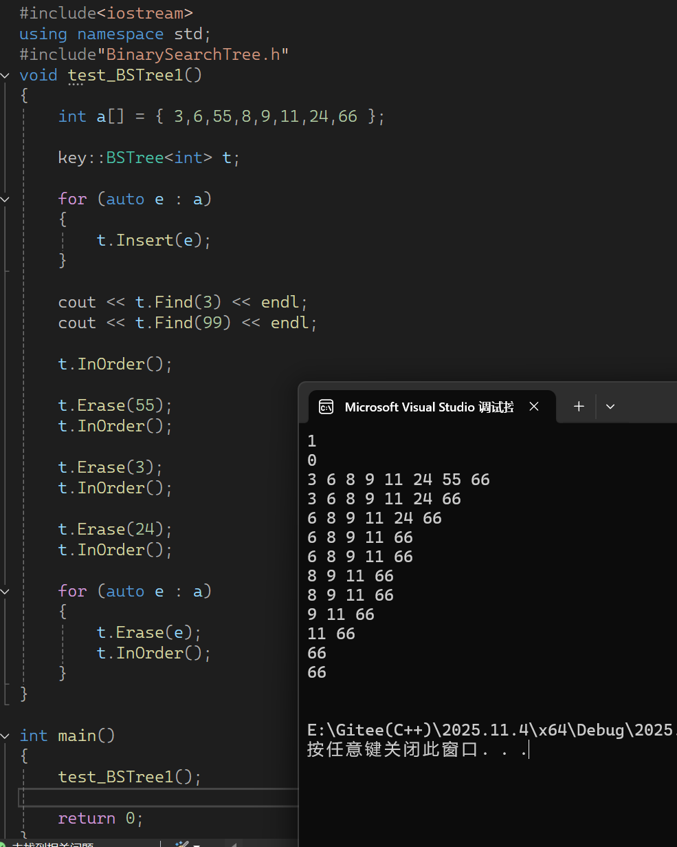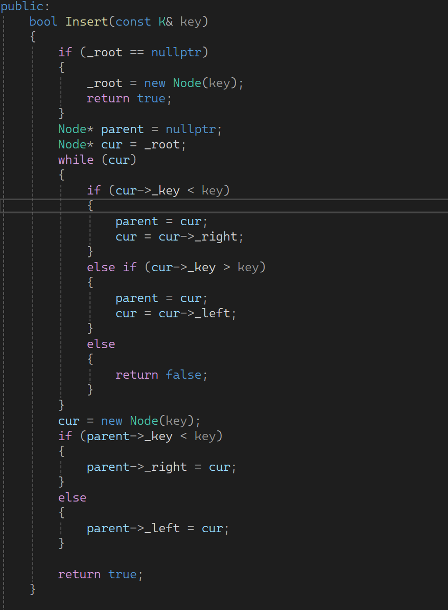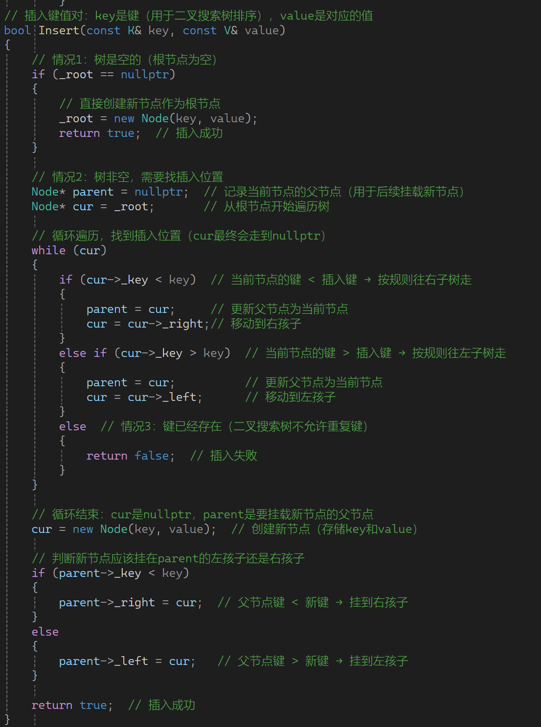 - 返回值 bool :二叉搜索树要求键值唯一(不能存重复key),所以返回 true =插入成功(key是新的), false =插入失败(key已在树中)。