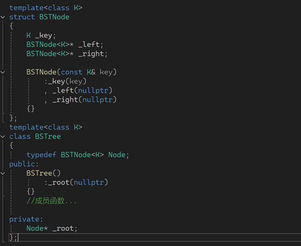 - 首先我们需要一个struct结构体作为二叉搜索树中的节点BSTreeNode,由于这个节点中的成员变量要被经常访问,那么我们将其定义为strcut,那么这个节点中存储左右节点的指针即_left和_right,同时还存储有一个模板K类型的变量_key