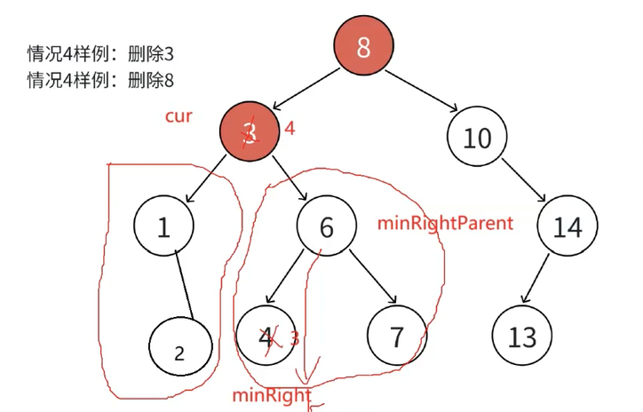 {// 1. 找到cur右子树的最小值节点minRight及其父节点minRightParentNode* minRightParent = cur; // 初始化minRight的父节点为curNode* minRight = cur->_right; // 初始化minRight为cur的右孩子while (minRight->_left) // 循环找最左节点(左子树为空时停止){minRightParent = minRight; // 父节点随子节点移动minRight = minRight->_left; // 子节点向左移动}// 2. 交换cur和minRight的值:用minRight的值“覆盖”cur的位置swap(cur->_key, minRight->_key);// 3. 删除minRight(其左子树为空,按场景一逻辑处理)if (minRight == minRightParent->_left) // minRight是父节点的左孩子{minRightParent->_left = minRight->_right; // 父节点左指针指向minRight的右子树}else // minRight是父节点的右孩子(仅当cur右子树无左分支时触发){minRightParent->_right = minRight->_right; // 父节点右指针指向minRight的右子树}delete minRight; // 释放minRight的内存