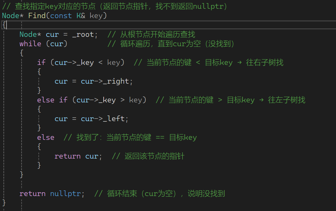 - 找到则返回对应节点指针,遍历到空( cur=nullptr )则返回 nullptr (没找到)。