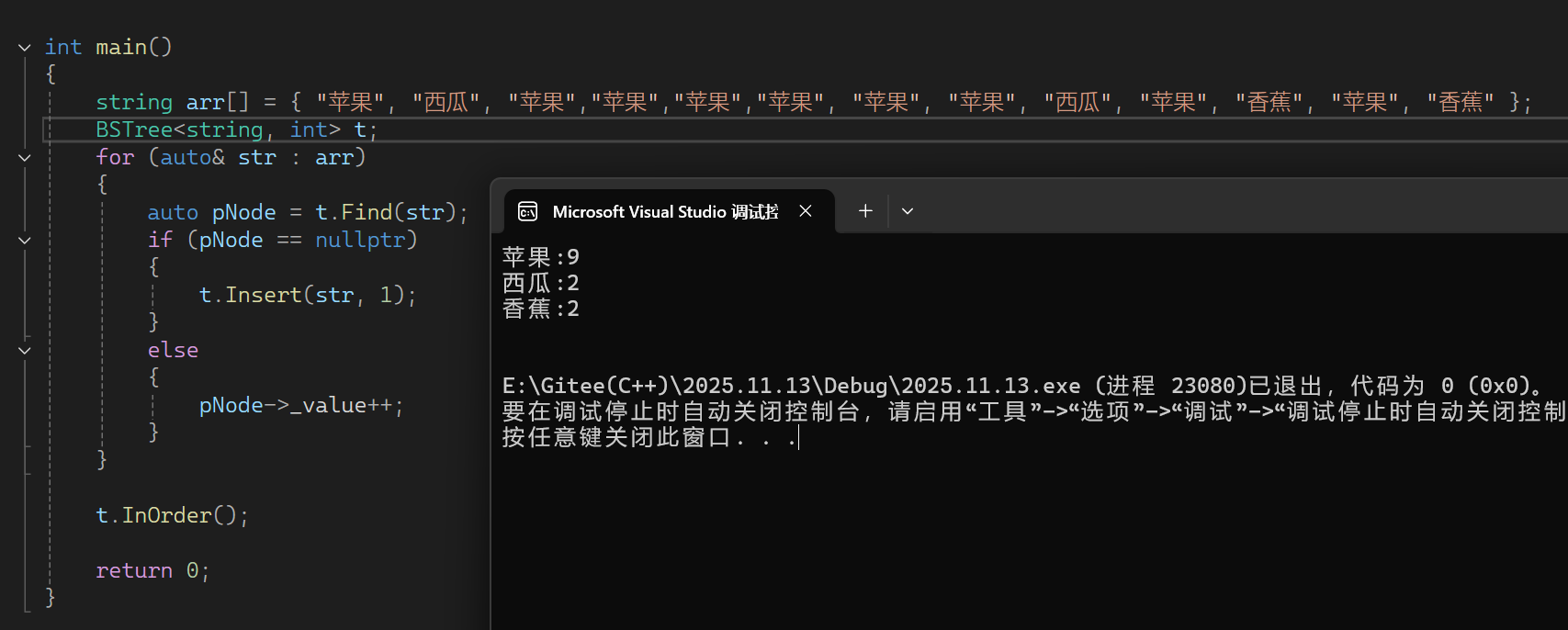 调用 InOrder() (二叉搜索树的中序遍历),由于二叉搜索树的特性,最终会按字符串的字典序输出每个字符串及其对应的出现次数(如调试窗口中“苹果:9、西瓜:2、香蕉:2”)。