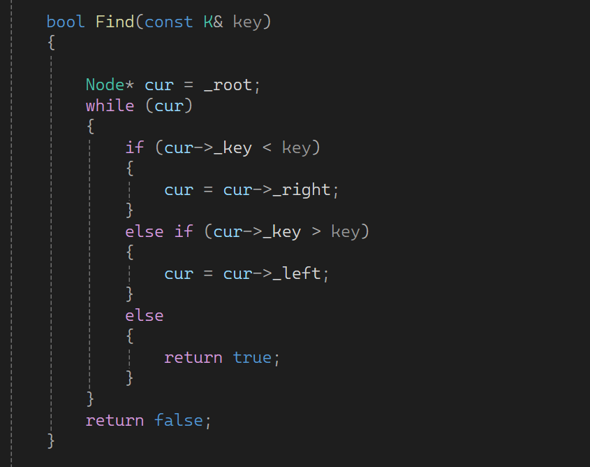 - 若 cur->_key < key :目标在右子树, parent 更新为当前 cur , cur 移动到右孩子;