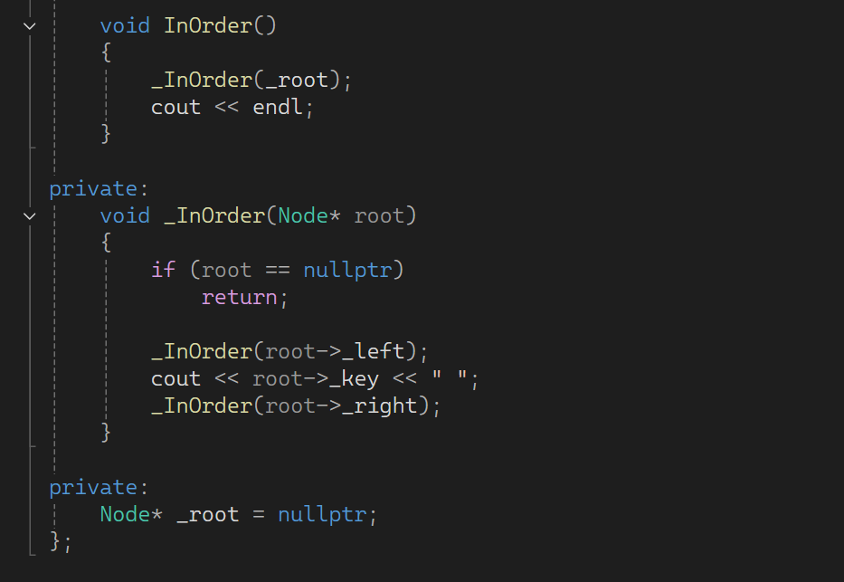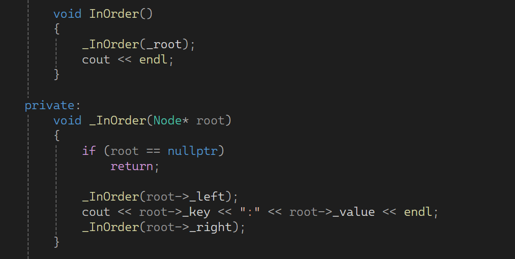 {if (root == nullptr) //递归终止条件return;_InOrder(root->left); // 先遍历左子树cout << root->key << " "; // 再访问当前节点的键值_InOrder(root->right); // 最后遍历右子树
