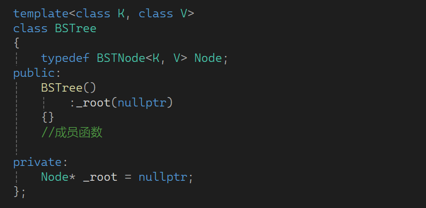 - 除此之外我们还应该定义一个二叉搜索树的类模板BSTree,由于需要对成员进行封装所以采用class进行定义这个二叉搜索树,那么初始只需要一个私有成员变量即根节点_root,为了便于定义和使用节点我们使用typedef将节点类型BSTreeNode<K>重命名为Node便于使用