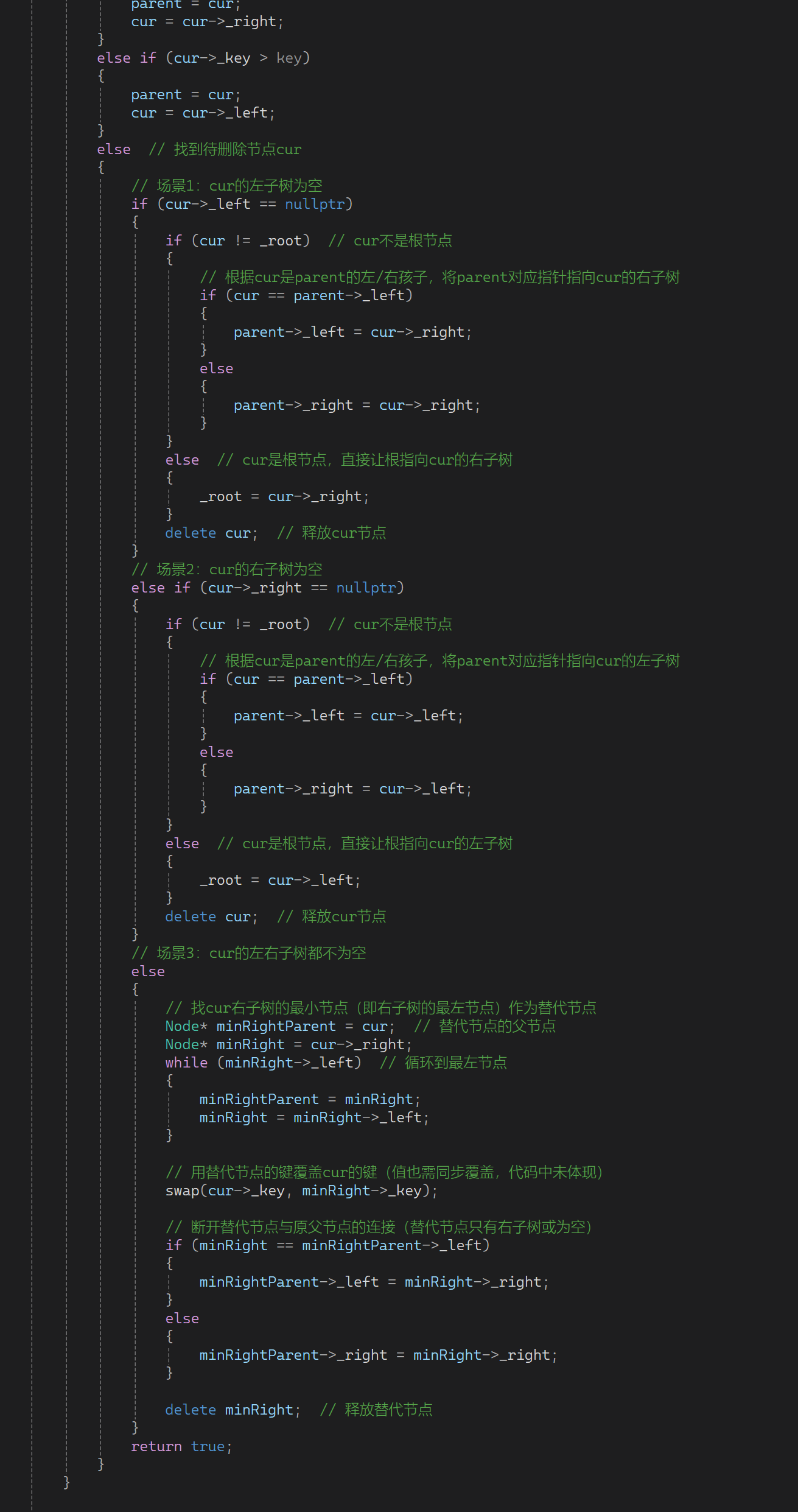 {Node* parent = nullptr;Node* cur = _root;while (cur){if (cur->_key < key){parent = cur;cur = cur->_right;}else if (cur->_key > key){parent = cur;cur = cur->_left;}else{//准备删除if (cur->_left == nullptr){if (cur != _root){//左为空 , 父亲指向右if (cur == parent->_left){parent->_left = cur->_right;}else{parent->_right = cur->_right;}}else{_root = cur->_right;}delete cur;}else if (cur->_right == nullptr){if (cur != _root){//右为空 , 父亲指向左if (cur == parent->_left){parent->_left = cur->_left;}else{parent->_right = cur->_left;}}else{_root = cur->_left;}delete cur;}else{//左右都不为空 , 找子树中合适的节点代替Node* minRightParent = cur;Node* minRight = cur->_right;while (minRight->_left){minRightParent = minRight;minRight = minRight->_left;}swap(cur->_key, minRight->_key);if (minRight == minRightParent->_left)minRightParent->_left = minRight->_right;elseminRightParent->_right = minRight->_right;delete minRight;}return true;}}return false;