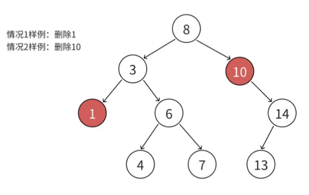 - 删除节点10 : 节点10的左子树为空,父节点是8,且是8的右孩子。执行 parent->_right = cur->_right (即8的右指针指向10的右子树14),再 delete 节点10,完成删除。