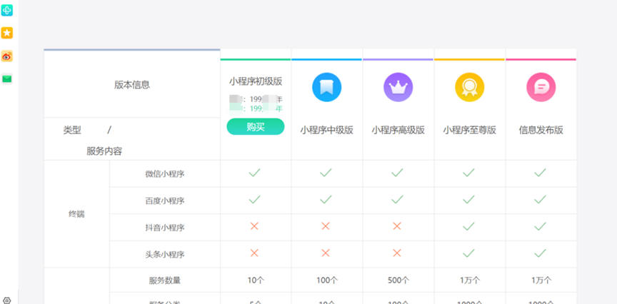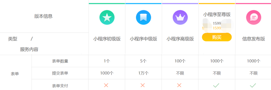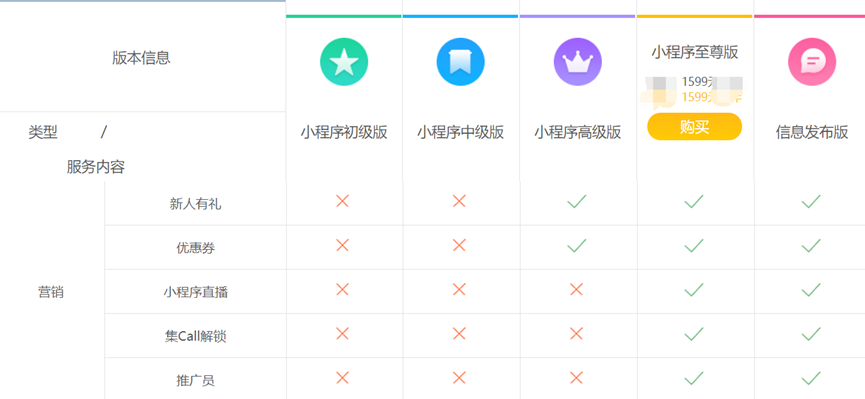 比如你要展示的内容少,只有几个产品,选初级版本就够了。但如果你想在小程序上开展营销互动,如小程序直播、推广员、优惠券、新人有礼等活动,初级版本就不够用,得考虑更高版本。