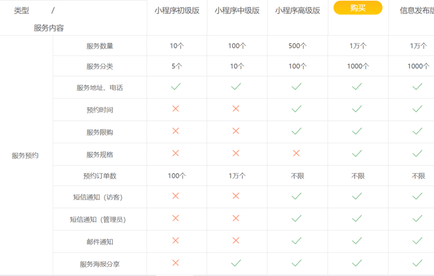 小程序支持服务预约,不同版本在预约支持数量、分类、预约订单数量等方面存在差异。要根据业务量选择合适的版本,够用就行。若后续业务发展快,还能追加升级。