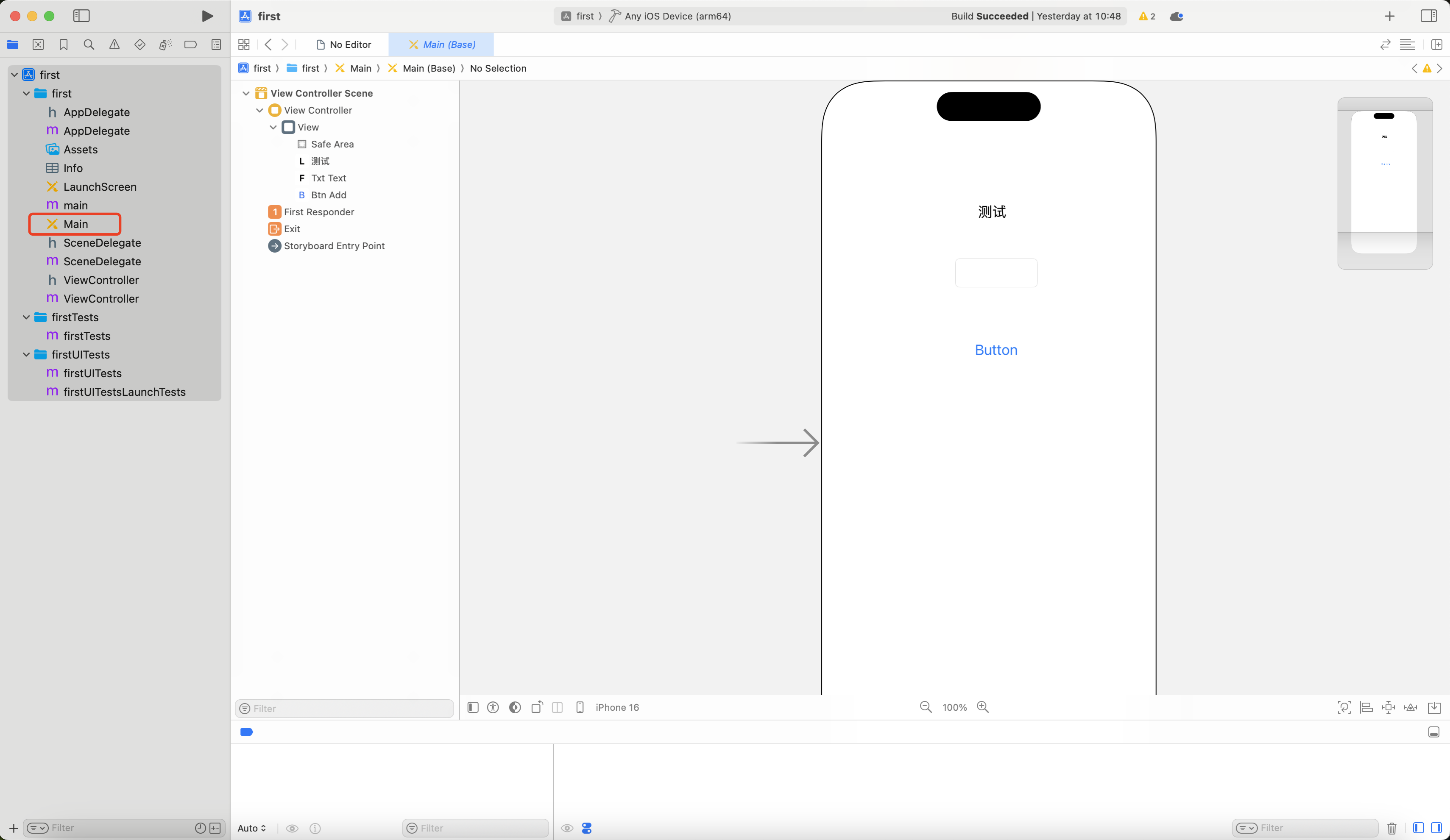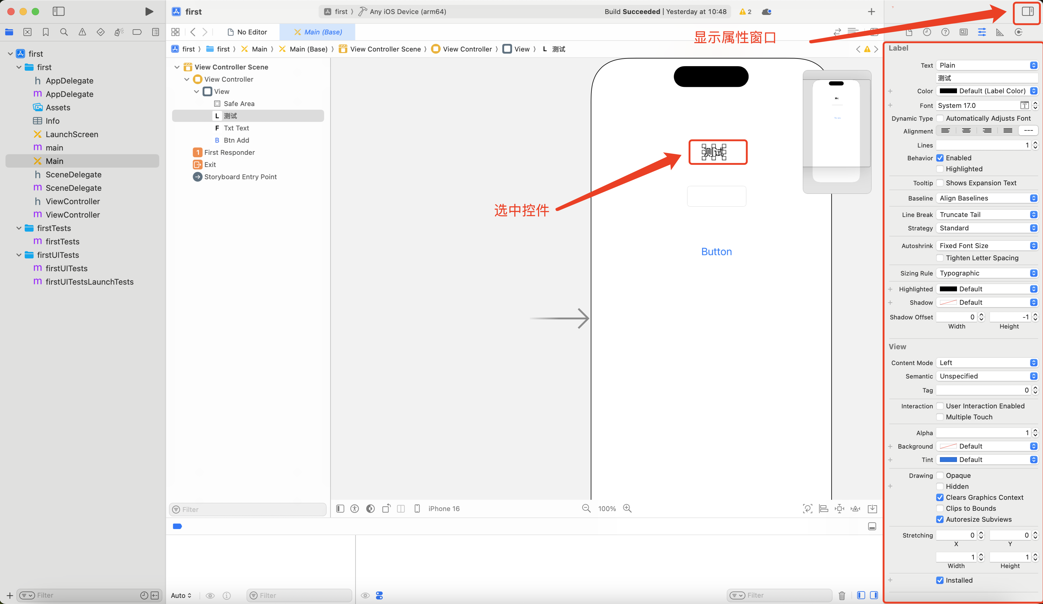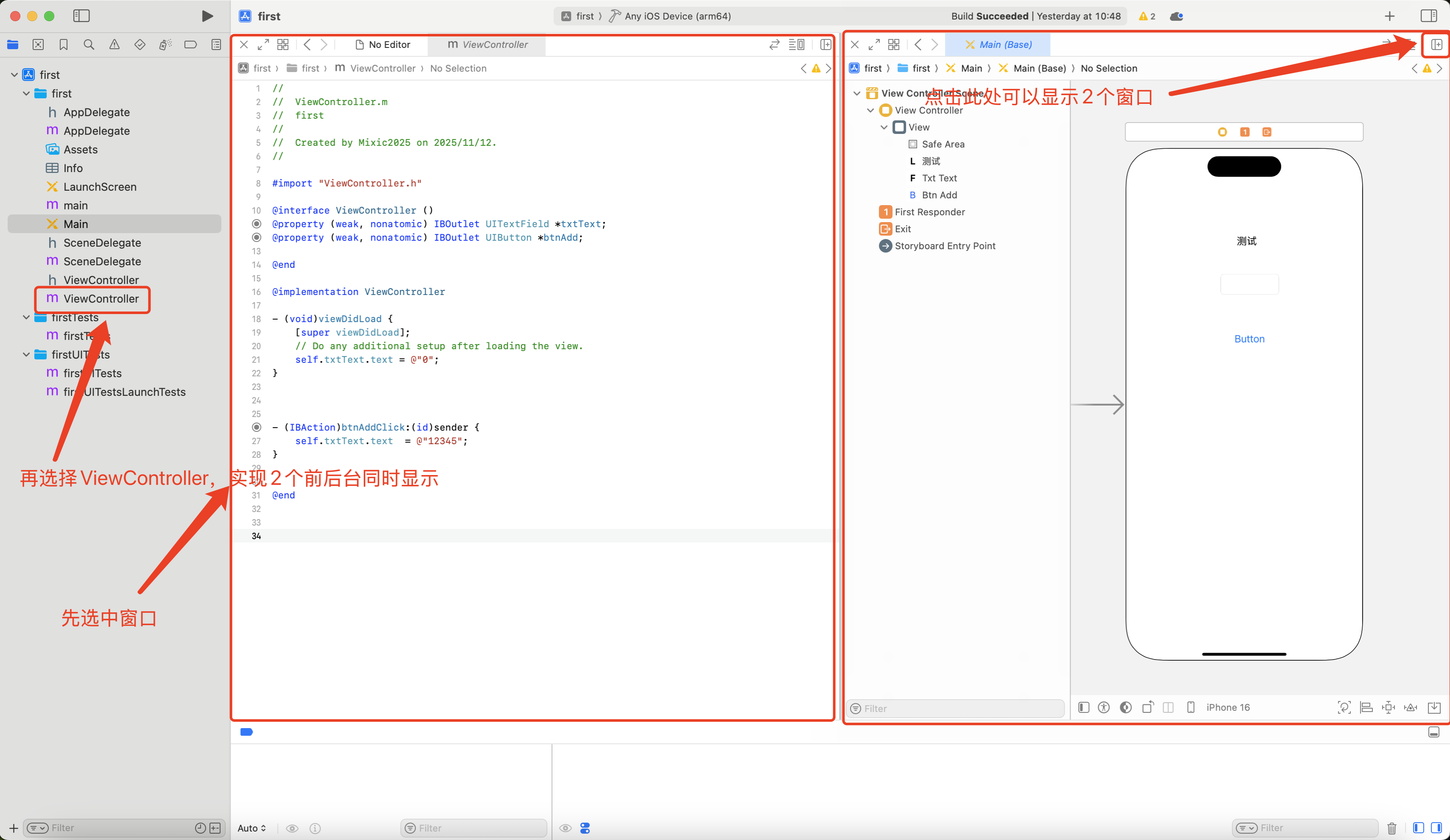 3.同时显示前后台,Main.storyboard和ViewControler.m都需要显示在前台。