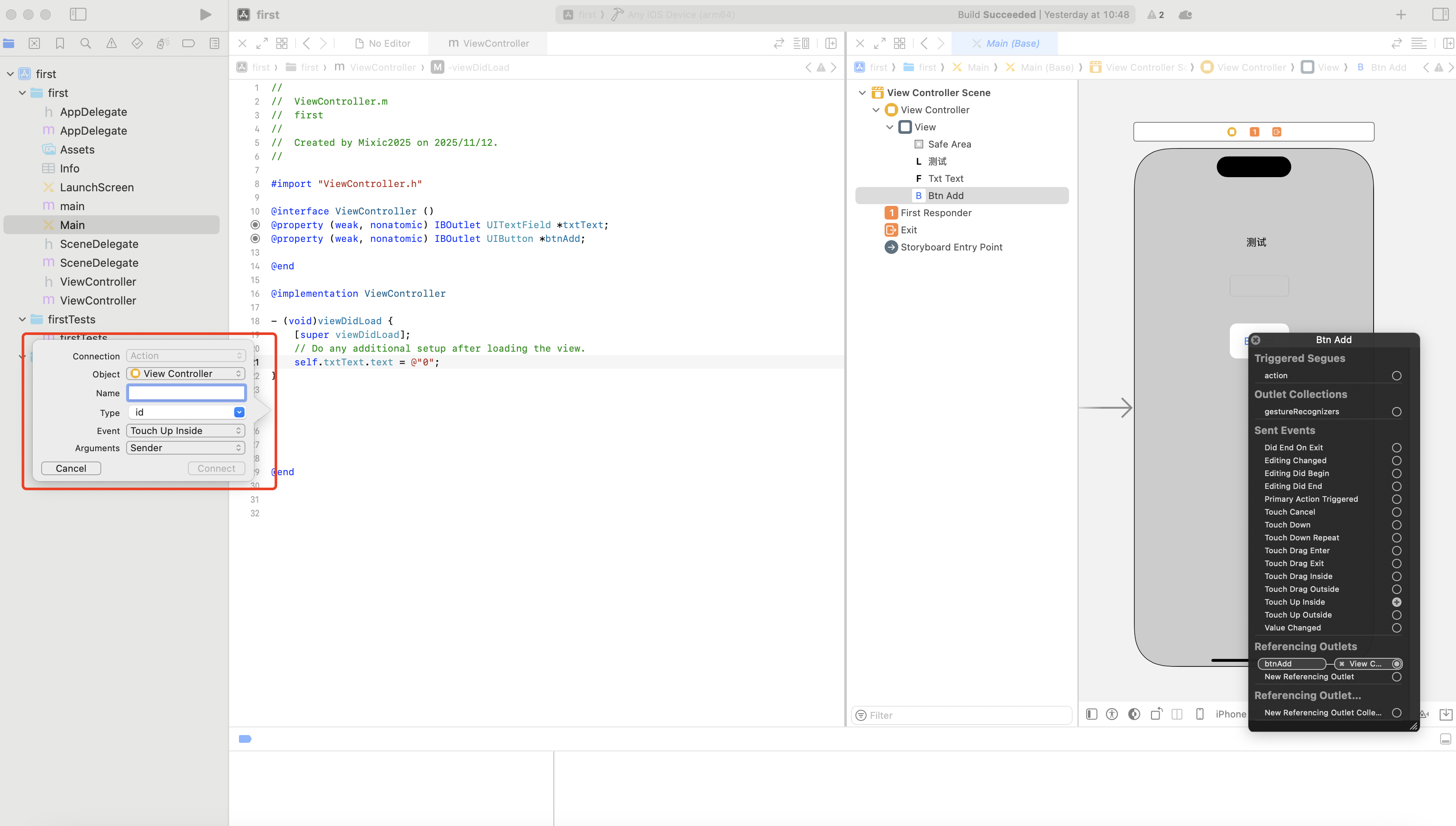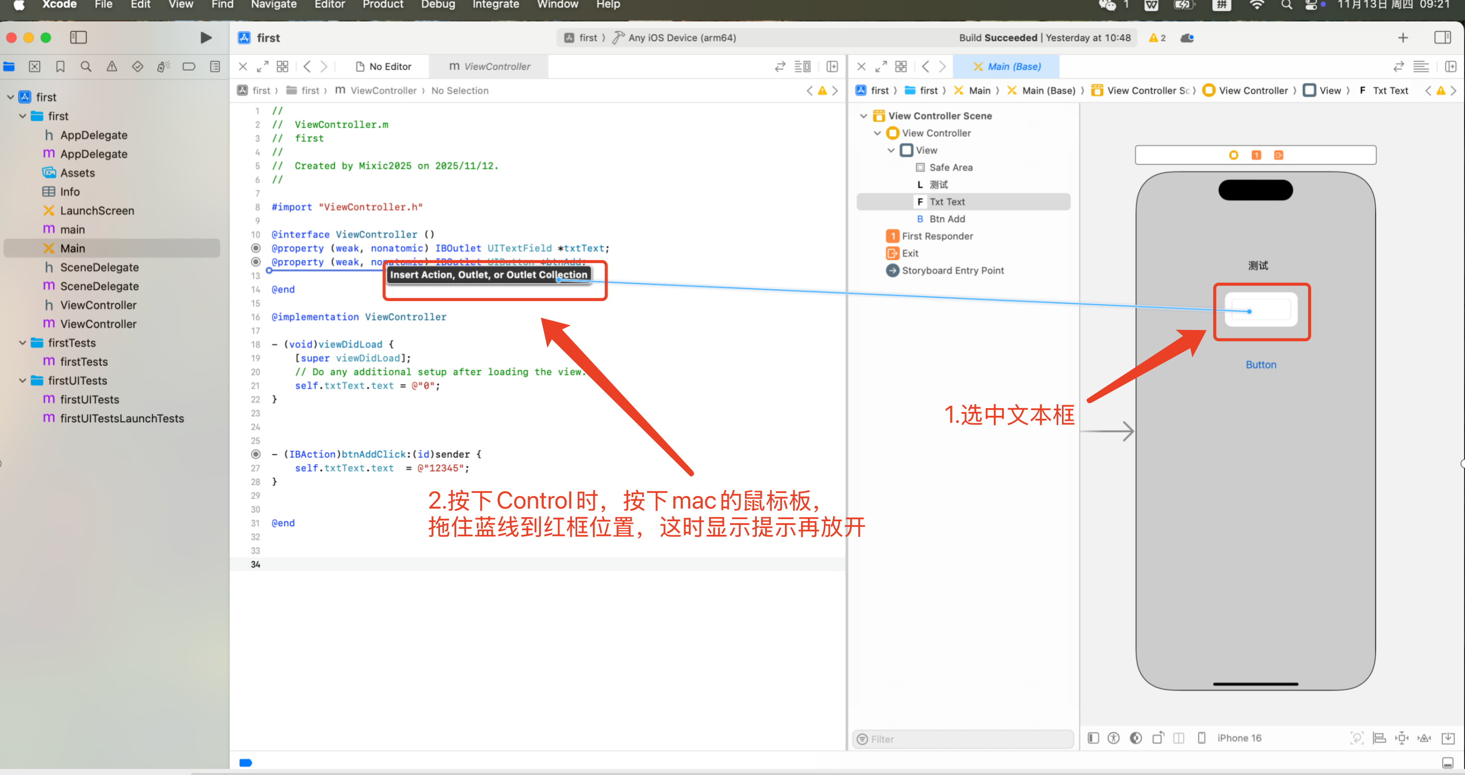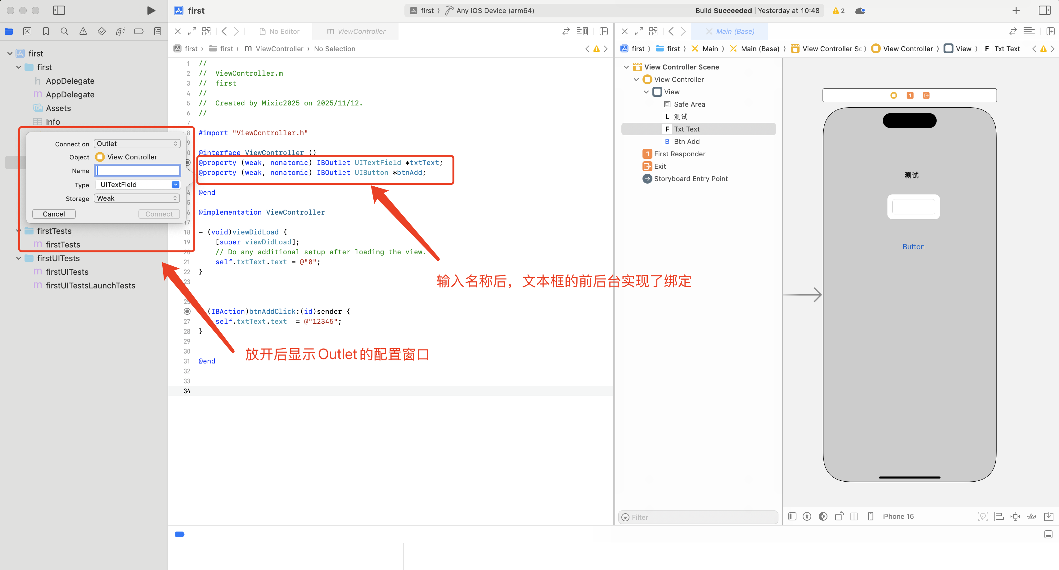 放开以后显示outlet的配置窗口,按钮也进行相同操作,实现了文本框和按钮的前后台绑定,ViewController.m中就可以对,main窗口中的控件进行操作了。