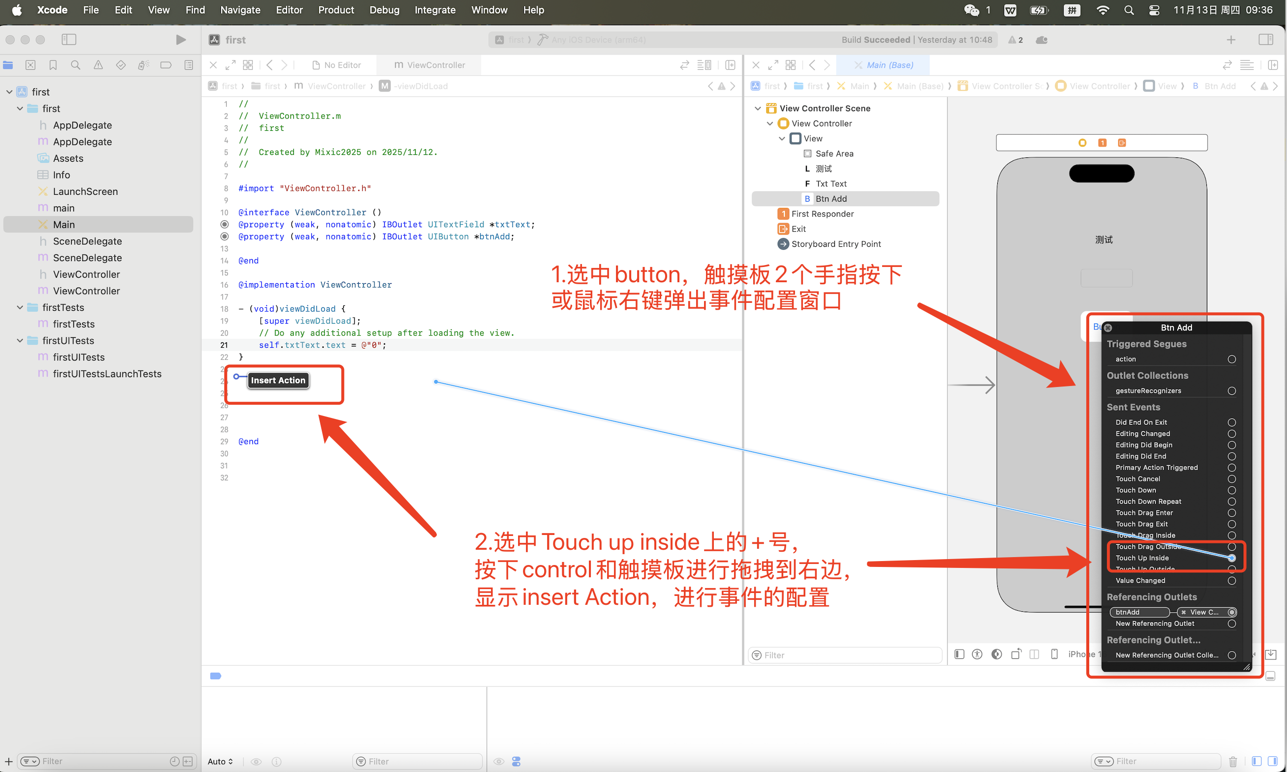 IBAction标记并与控件事件绑定。 - 实现方式:拖拽控件事件到代码中生成方法,触发时执行对应逻辑(如更新界面状态)。 13