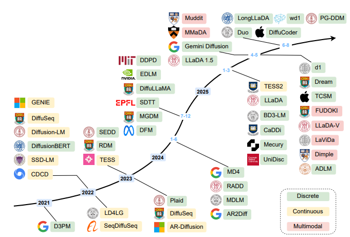 混合AR-DLMs:结合AR模型的「长程依赖建模能力」与DLM的「并行生成能力」,典型方案是「块级AR+块内DLM」——将文本分为多个块,块与块之间采用AR生成(保证全局连贯),块内部采用DLM并行生成(提升速度)。