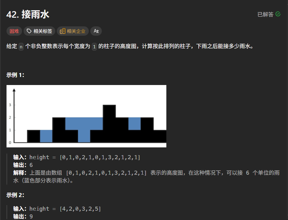 class Solution:def trap(self, height: List[int]) -> int:if not height:return 0n =len(height)L_max = [height[0]] + [0]*(n-1)R_max = [0]*(n-1) +[height[n-1]]for i in range(1,n):if height[i] > L_max[i-1]:L_max[i] = height[i]else:L_max[i] = L_max[i-1]for i in range(1,n):if height[n-1-i] > R_max[n-i]:R_max[n-i-1] = height[n-1-i]else:R_max[n-i-1] =R_max[n-i]res = sum([min(L_max[i],R_max[i]) - height[i] for i in range(n)])return res