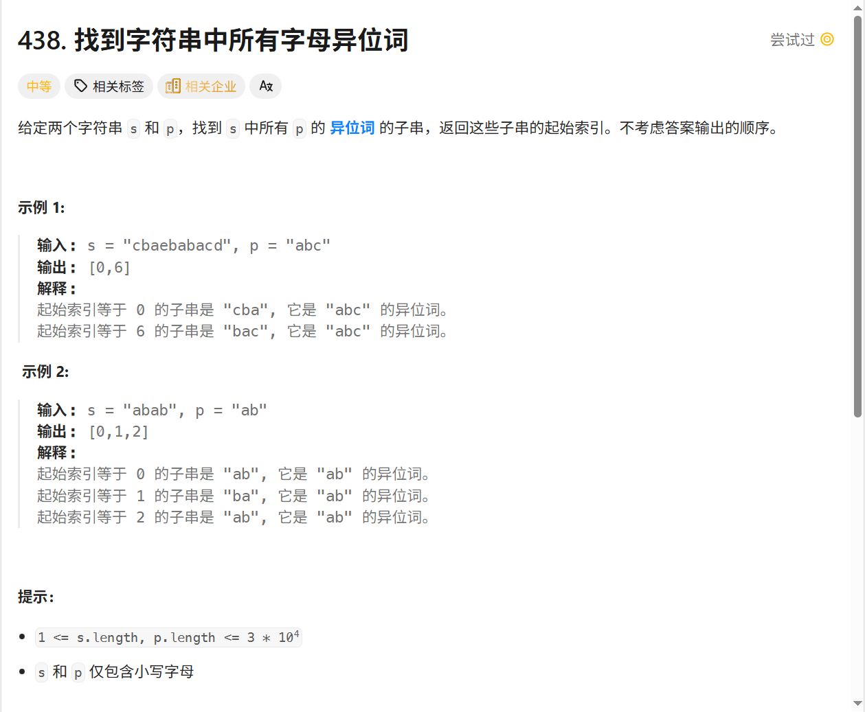 class Solution:def findAnagrams(self, s: str, p: str) -> List[int]:n_p = len(p)n_s = len(s)res = []for i in range(n_s - n_p +1 ):if sorted(s[i:i+n_p]) == sorted(p):res.append(i)return res