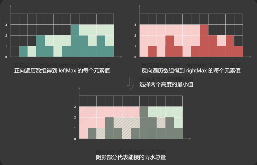 class Solution:def trap(self, height: List[int]) -> int:if not height:return 0n = len(height)leftMax = [height[0]] + [0] * (n - 1)for i in range(1, n):leftMax[i] = max(leftMax[i - 1], height[i])rightMax = [0] * (n - 1) + [height[n - 1]]for i in range(n - 2, -1, -1):rightMax[i] = max(rightMax[i + 1], height[i])ans = sum(min(leftMax[i], rightMax[i]) - height[i] for i in range(n))return ans